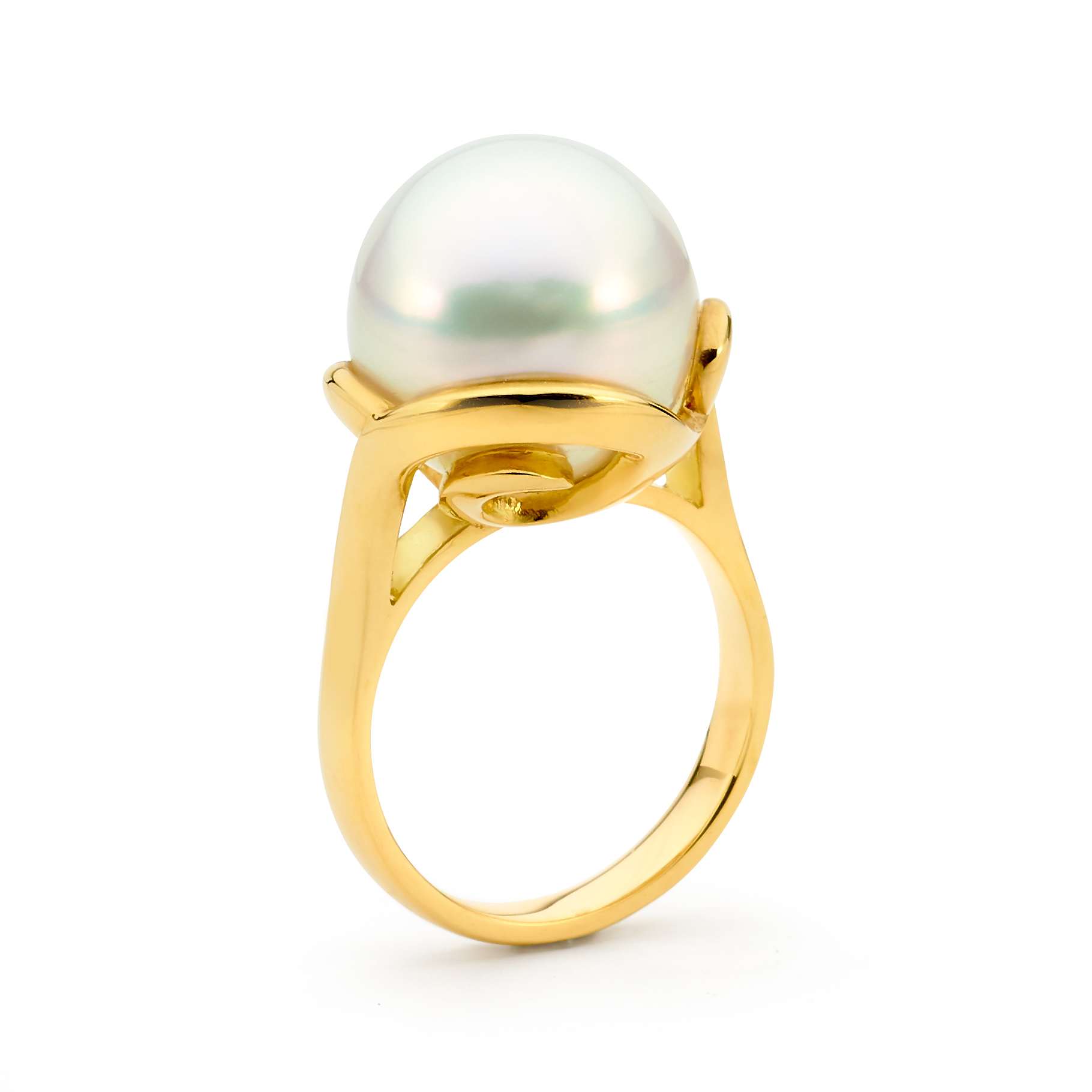An exclusive Fleur de Lis ring set in 18ct yellow gold and featuring an incredible 16.3mm high button white Australian South Sea pearl. If the design allows, we offer complimentary sizing of our rings up