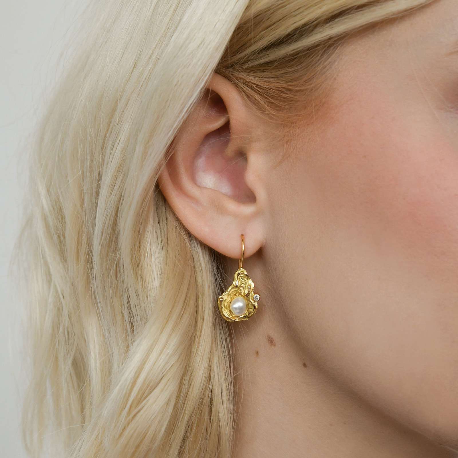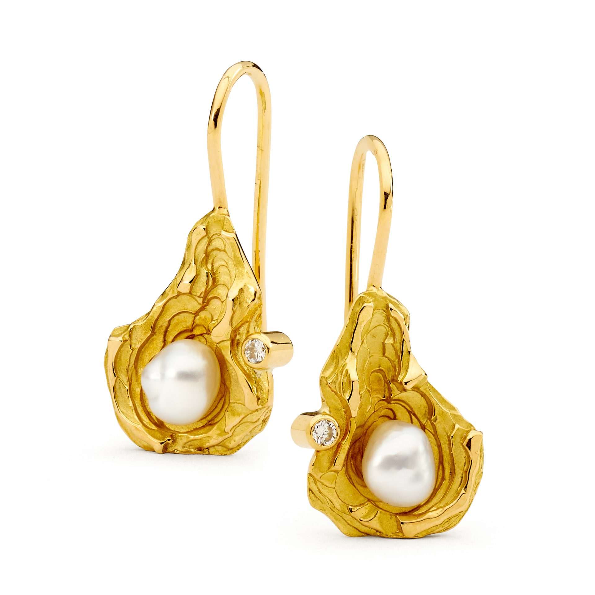 The Anastasiaโs Pool Earrings are set in 18ct yellow gold and feature two brilliant cut diamonds (2=0.04ct G/SI). They are complete with a pair of smooth baroque-shaped Australian South Sea keshi pearls.
