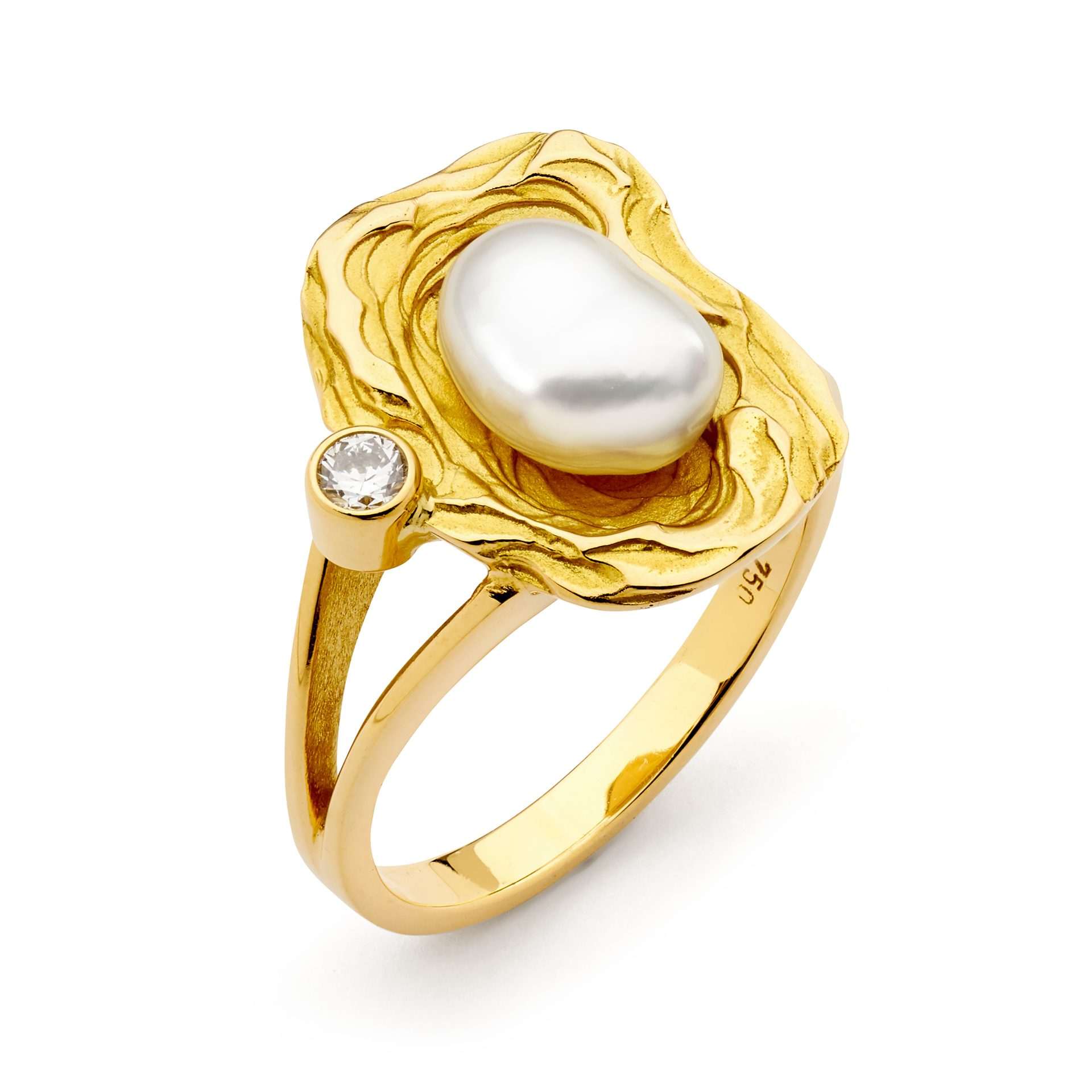 The Anastasiaโ€™s Pool Split Band Keshi Ring is crafted in 18ct yellow gold and features one brilliant cut diamond (1=0.10ct G/SI). This ring is complete with a single Australian South Sea keshi pearl (6.4×8.7mm) with excellent lustre.