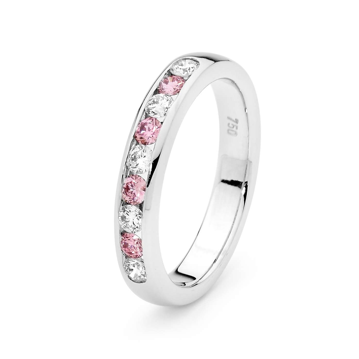 This 18ct white gold ring includes 4 x pink Argyle round brilliant cut diamonds (4=0.20ct 6P/SI) and 5 x white round brilliant cut diamonds (5=0.27ct F/VS)