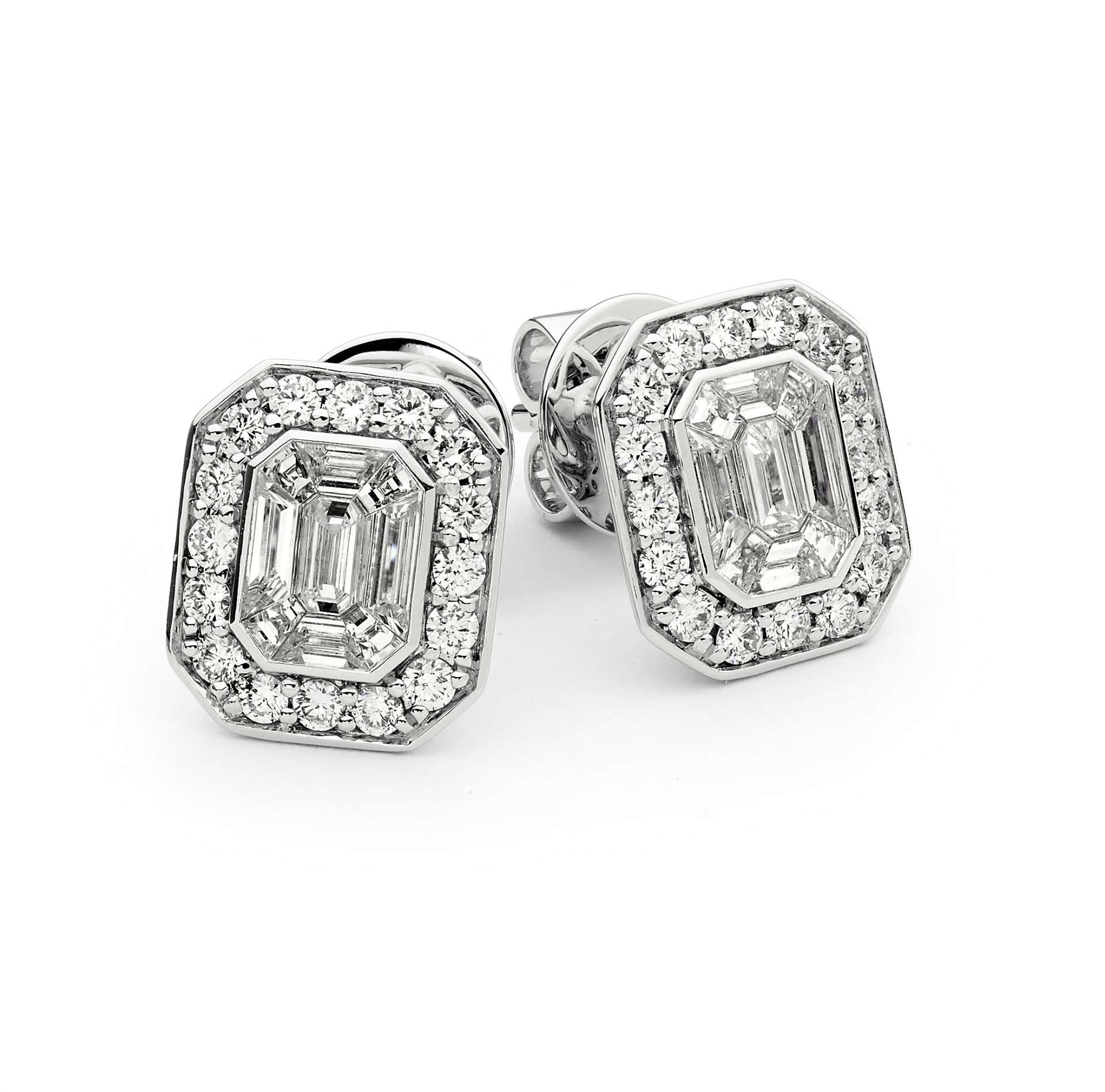 An elegant and timeless design that can be treasured for generations to come. Crafted in 18ct white gold, the beautiful Aura Stud Earrings feature Magic Emerald (18=0.82ct F/G VS+) and 32=0.59ct G/SI round brilliant cut
