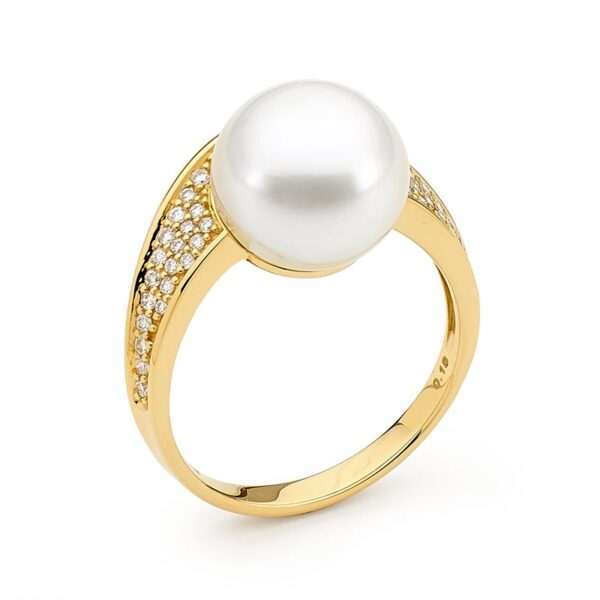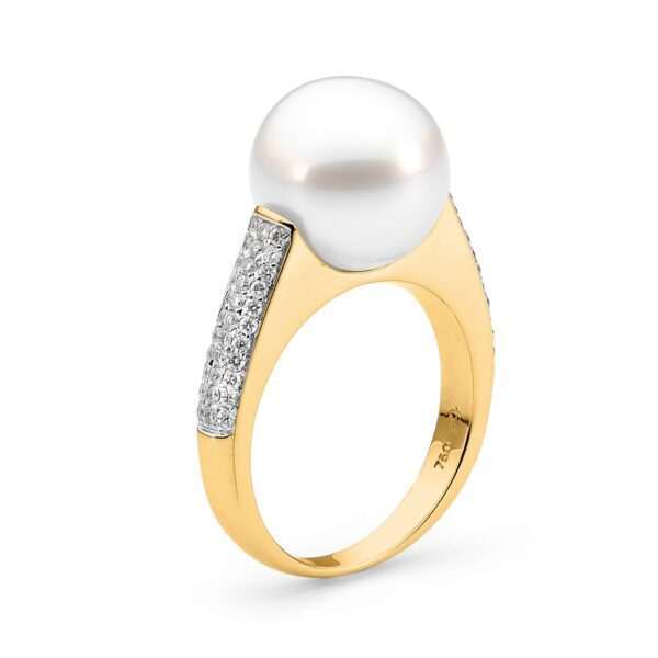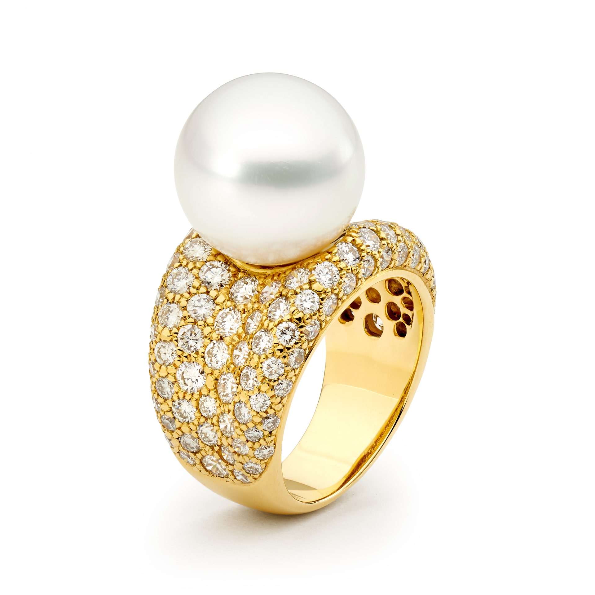 This extraordinary Australian South Sea pearl ring has been handcrafted in 18ct yellow gold and features a lustrous 14mm Australian South Sea cultured pearl and includes 122=4.01ct G/SI pave set diamonds.