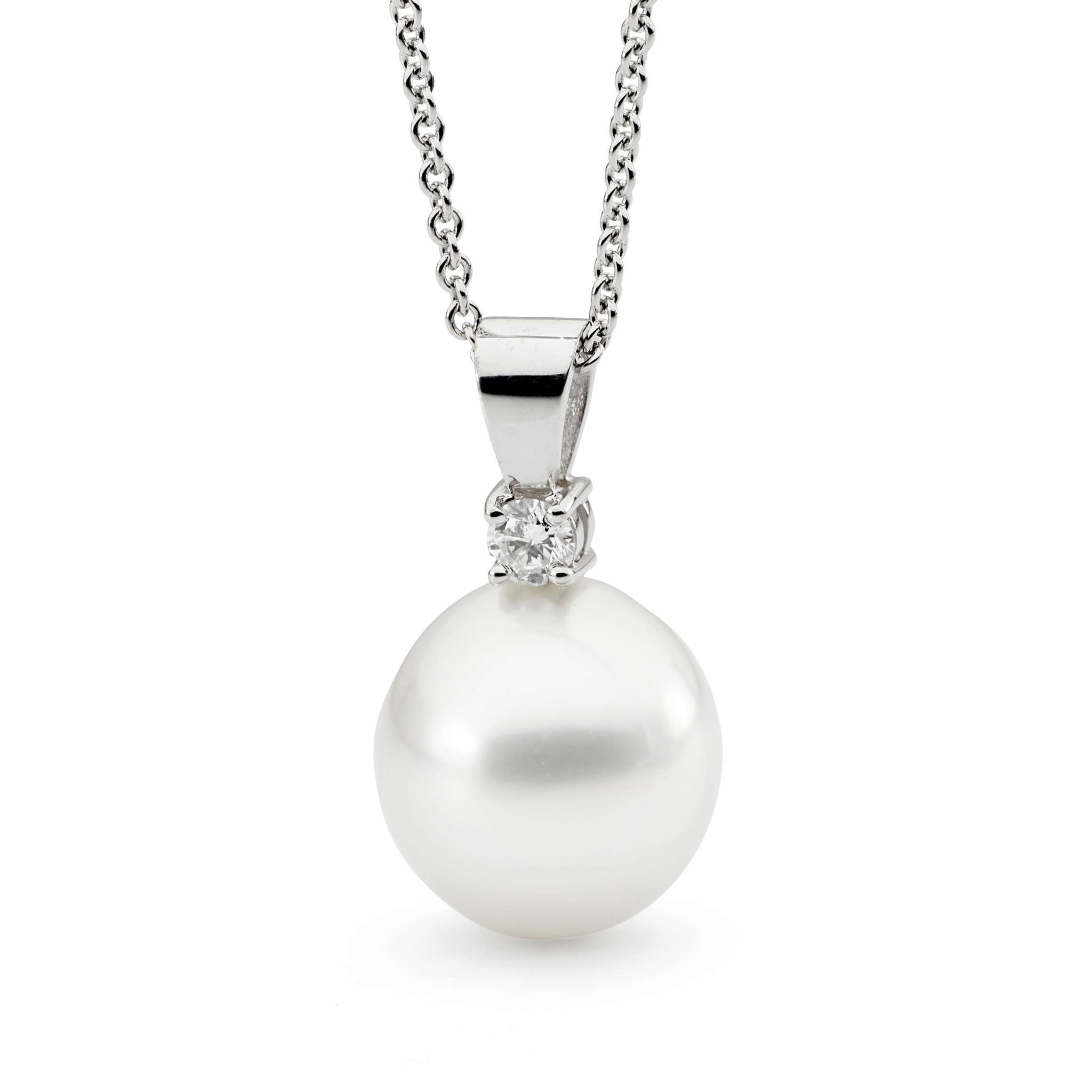 Handcrafted in 18ct white gold, this classic pearl pendant features a lustrous 14-15mm Australian South Sea oval/drop cultured pearl and 1=0.20ct G/SI round brilliant cut diamond.