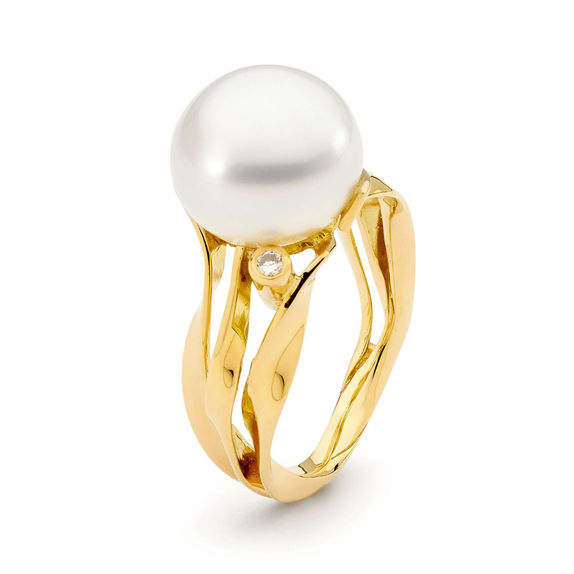 This Stunning ring is handcrafted in 18ct yellow gold and features an 11-12mm white button South Sea pearl, accentuated with 2=0.05ct white round brilliant cut diamonds (G/SI)