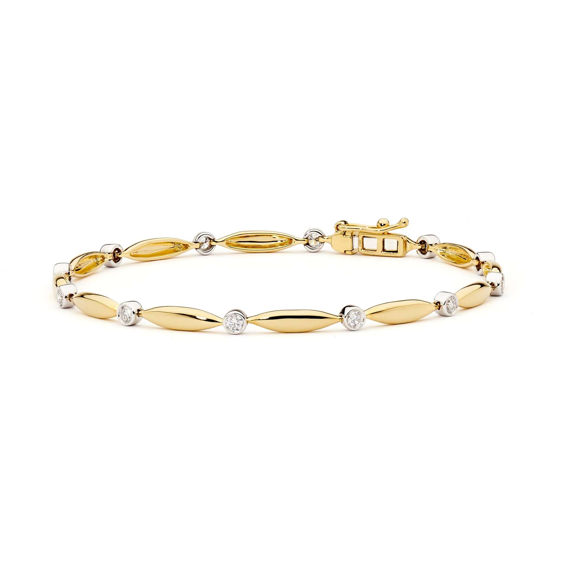 This Bar & Bezel Set link Diamond Bracelet is set in 18ct yellow gold and features 12 x round brilliant cut diamonds in an 18ct white gold bezel set equalling 0.50ct G/SI.