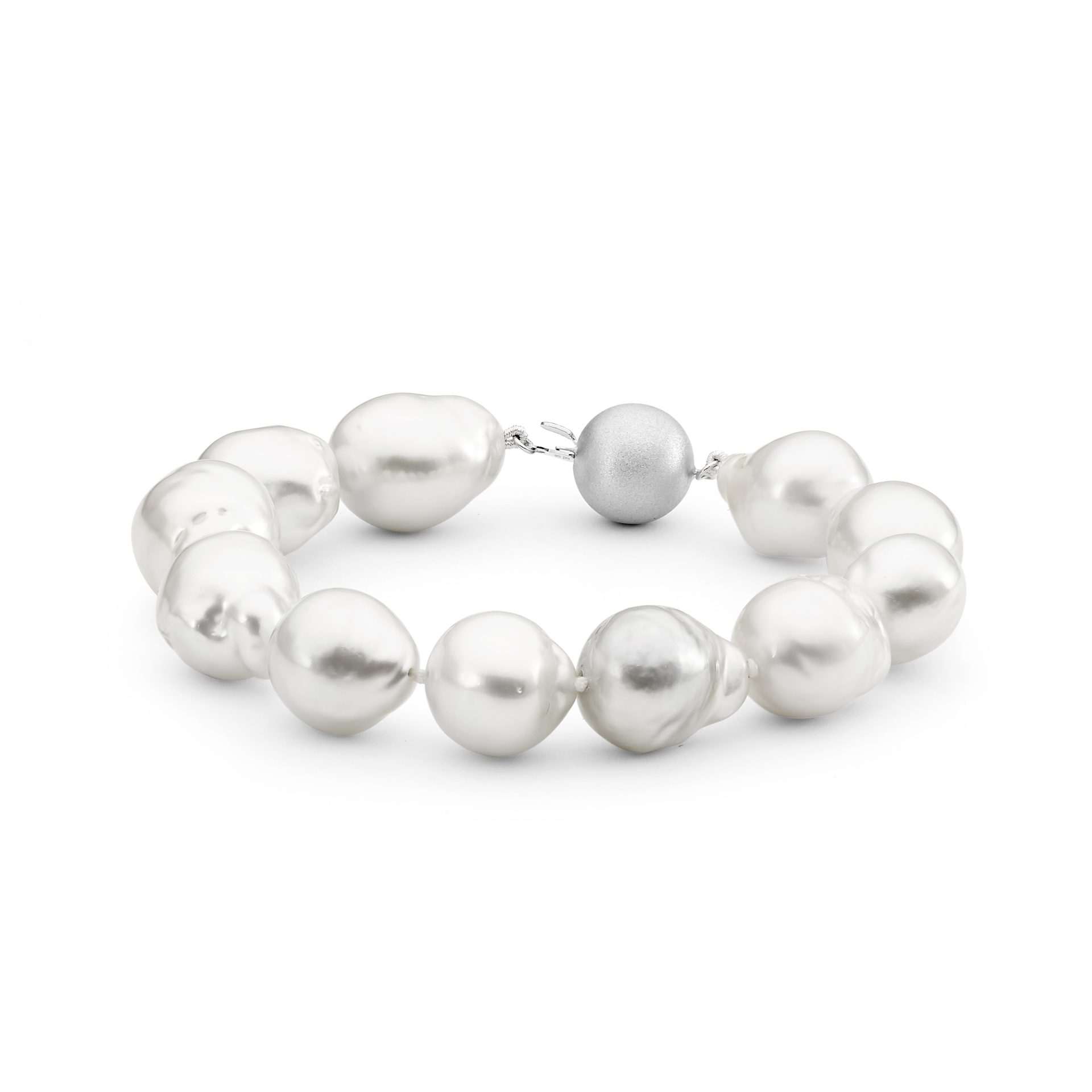 This pearl strand bracelet features 11x 12.9mm-14.5mm oval baroque South Sea cultured pearls and is complete with a 12mm 18ct white gold frosted ball clasp.