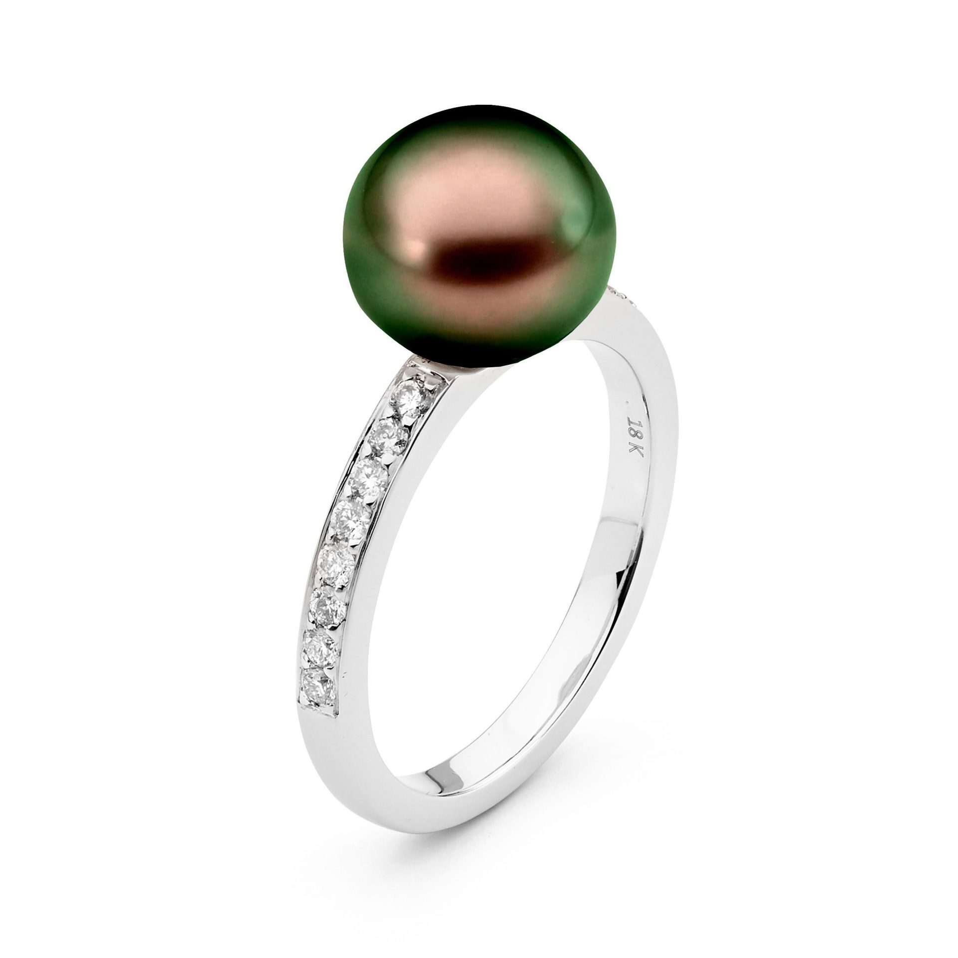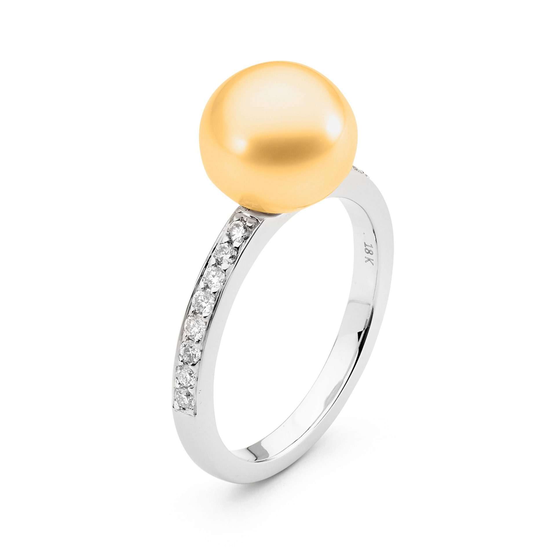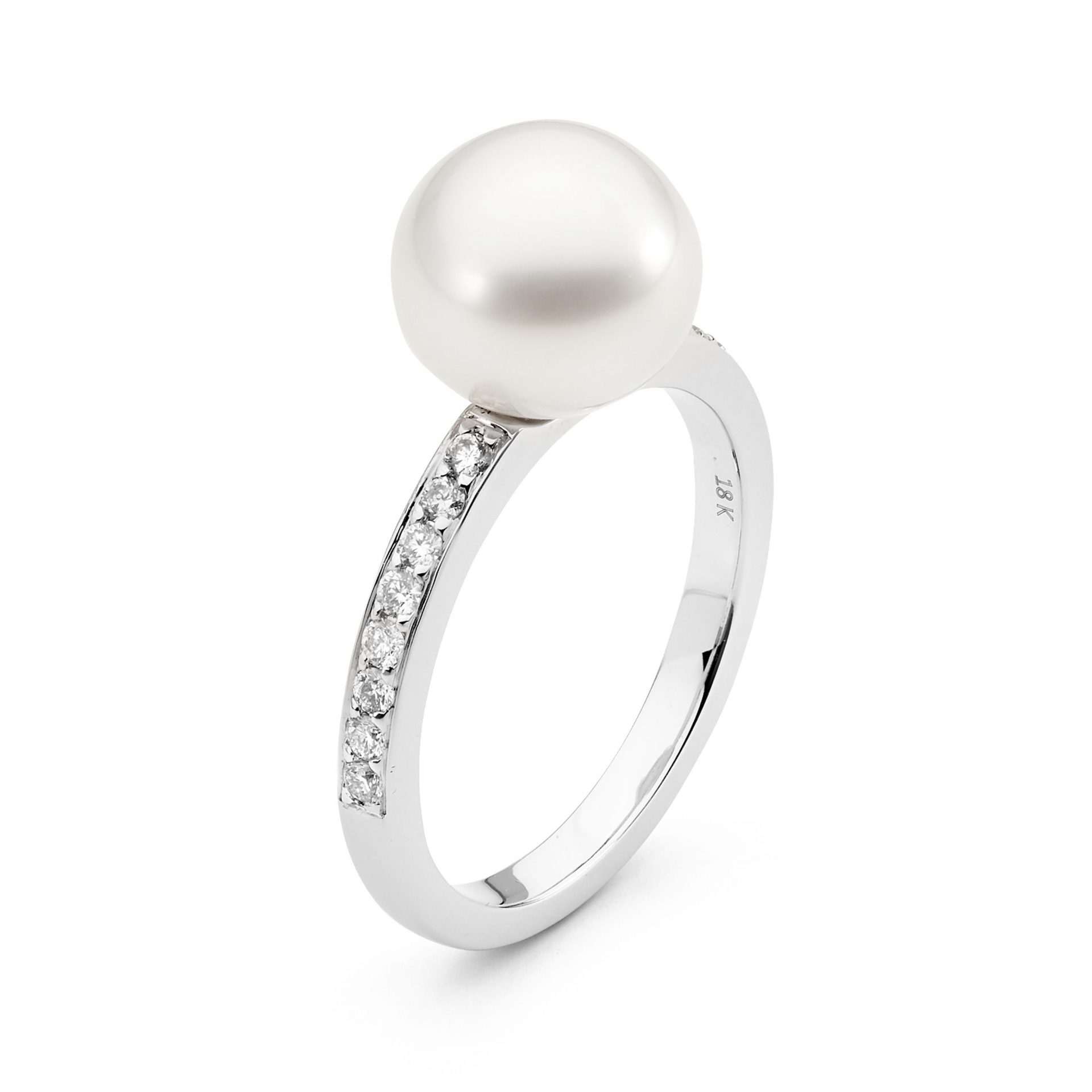 Timeless and elegant, this ring is crafted in 18ct gold and features 16 bead set, round brilliant cut diamonds totalling 0.23ct and a lustrous 9-10mm South Sea Pearl.