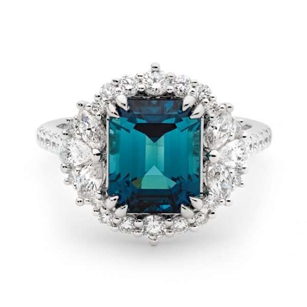 18ct white gold polished marquise shaped Blue Topaz & Diamond Pendant featuring 1=19.15ct Blue Topaz and 23=0.09ct G/SI round brilliant cut diamonds.