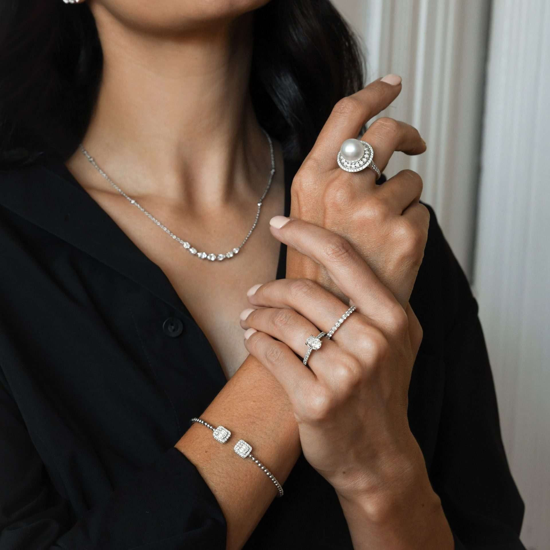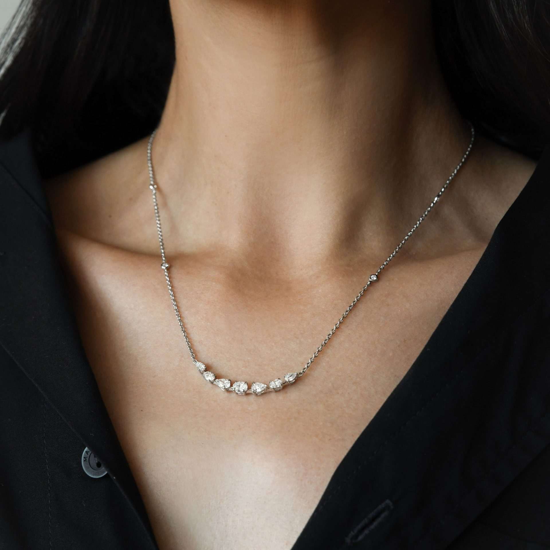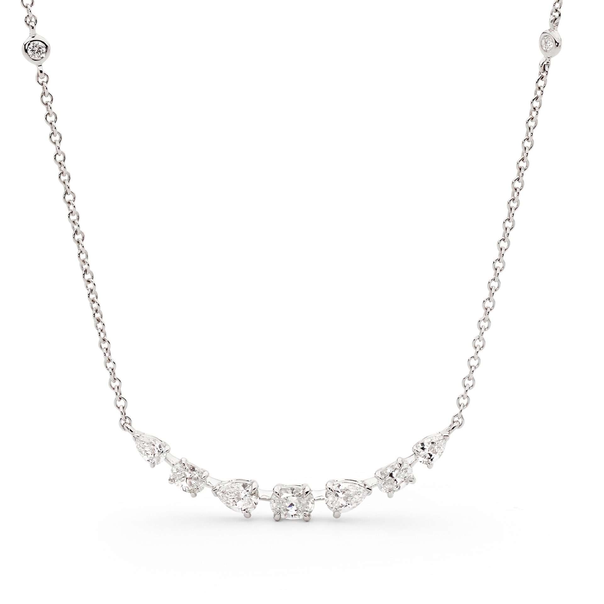 Set in 18ct white gold, this stunning diamond necklace features 4=0.11ct G/SI round brilliant cut diamonds, 3=0.48 oval cut diamonds (G/VS), 4=0.61 pear cut diamonds (G/VS) incorporating a fixed 45cm fine trace chain.
