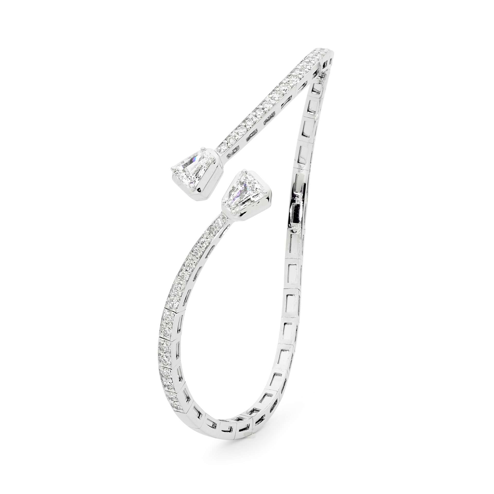 This exquisite 18ct white gold bangle showcases 32 totalling 0.71ct G/VS-SI round brilliant cut diamonds embedded into the bangle, and perfected with 2x (0.75ct) tapered baguette cut F/VVS claw set diamonds. Please get in touch