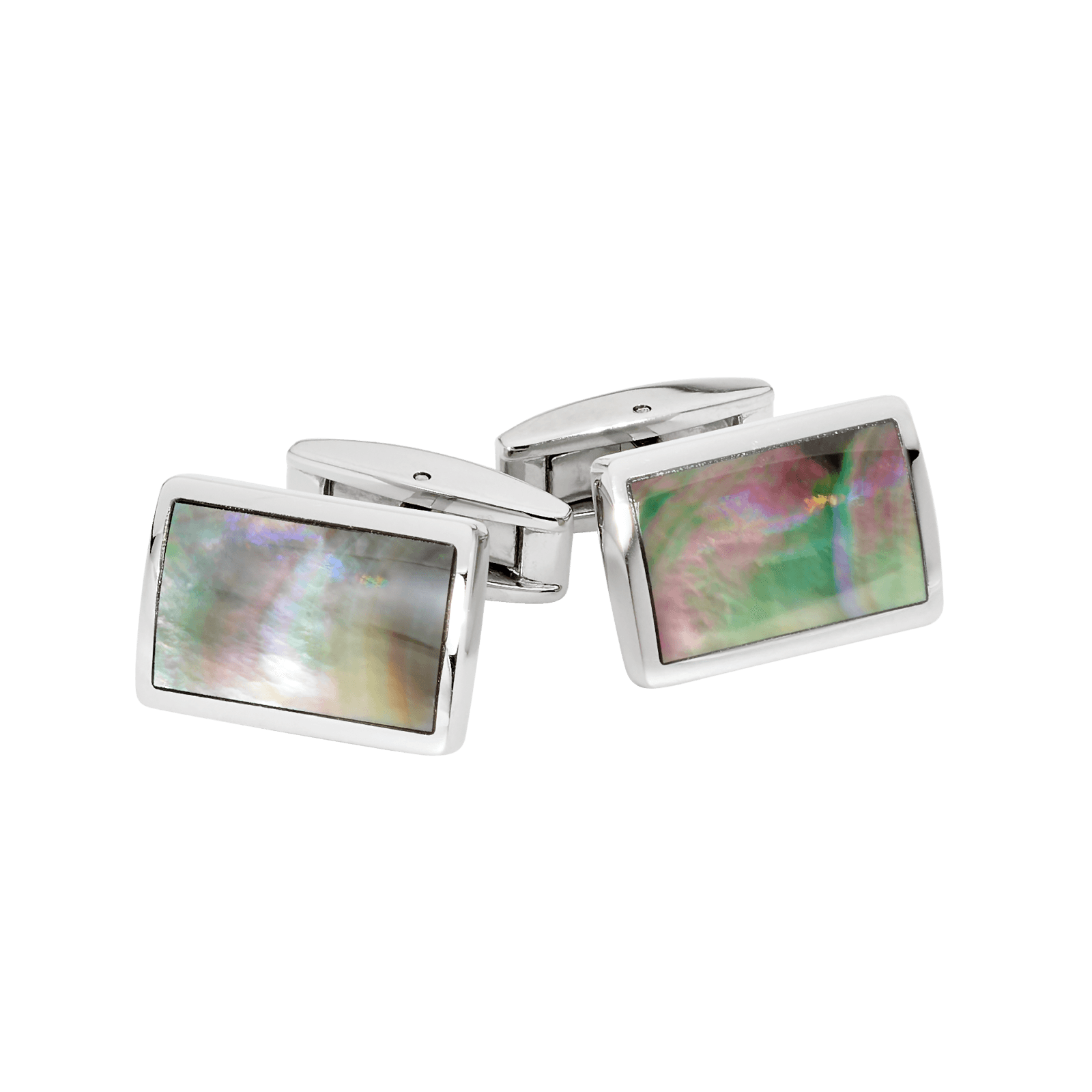 Crafted from polished stainless steel, these rectangular cufflinks are inlaid with an exquisite mother-of pearl shellย and finished with a T bar fastening.