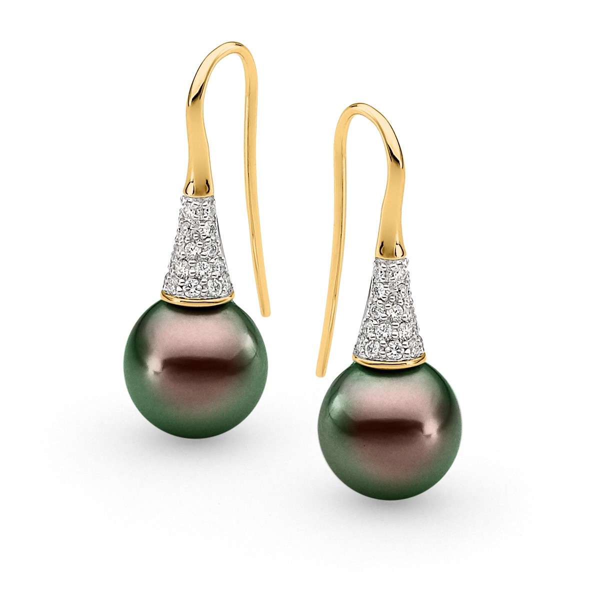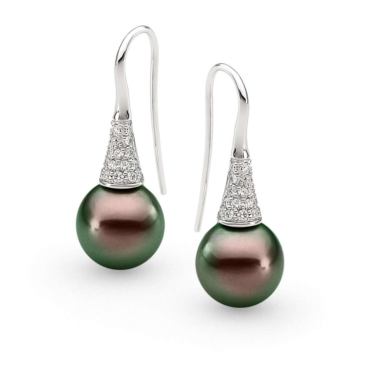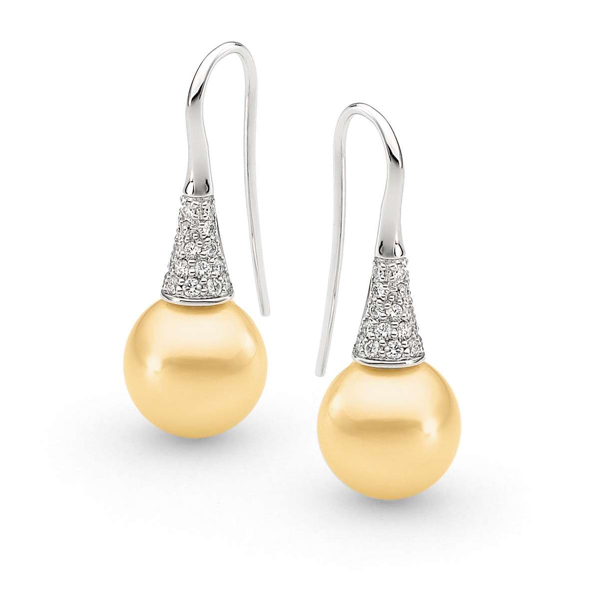 These lovely fluted French hook earrings are set in 18ct gold and feature white (0.54ct) diamonds and lustrous 12-13mm oval/drop white South Sea pearls. Available in 18ct yellow or white gold, with three pearl colour