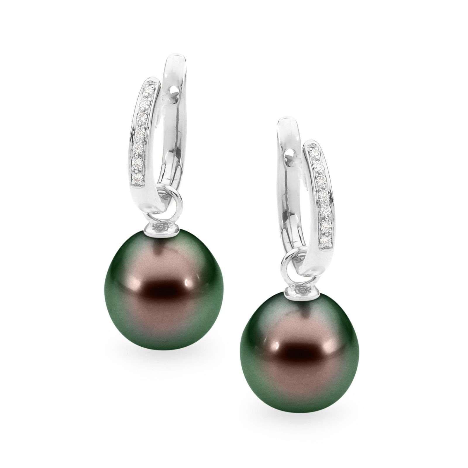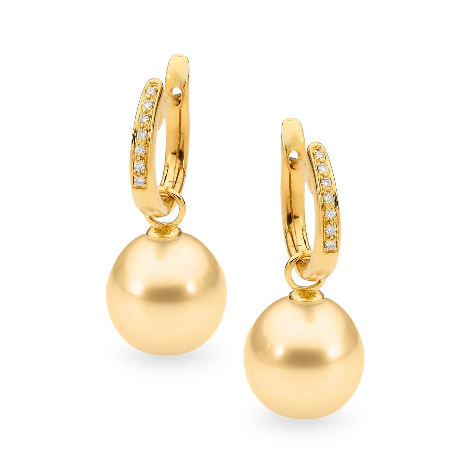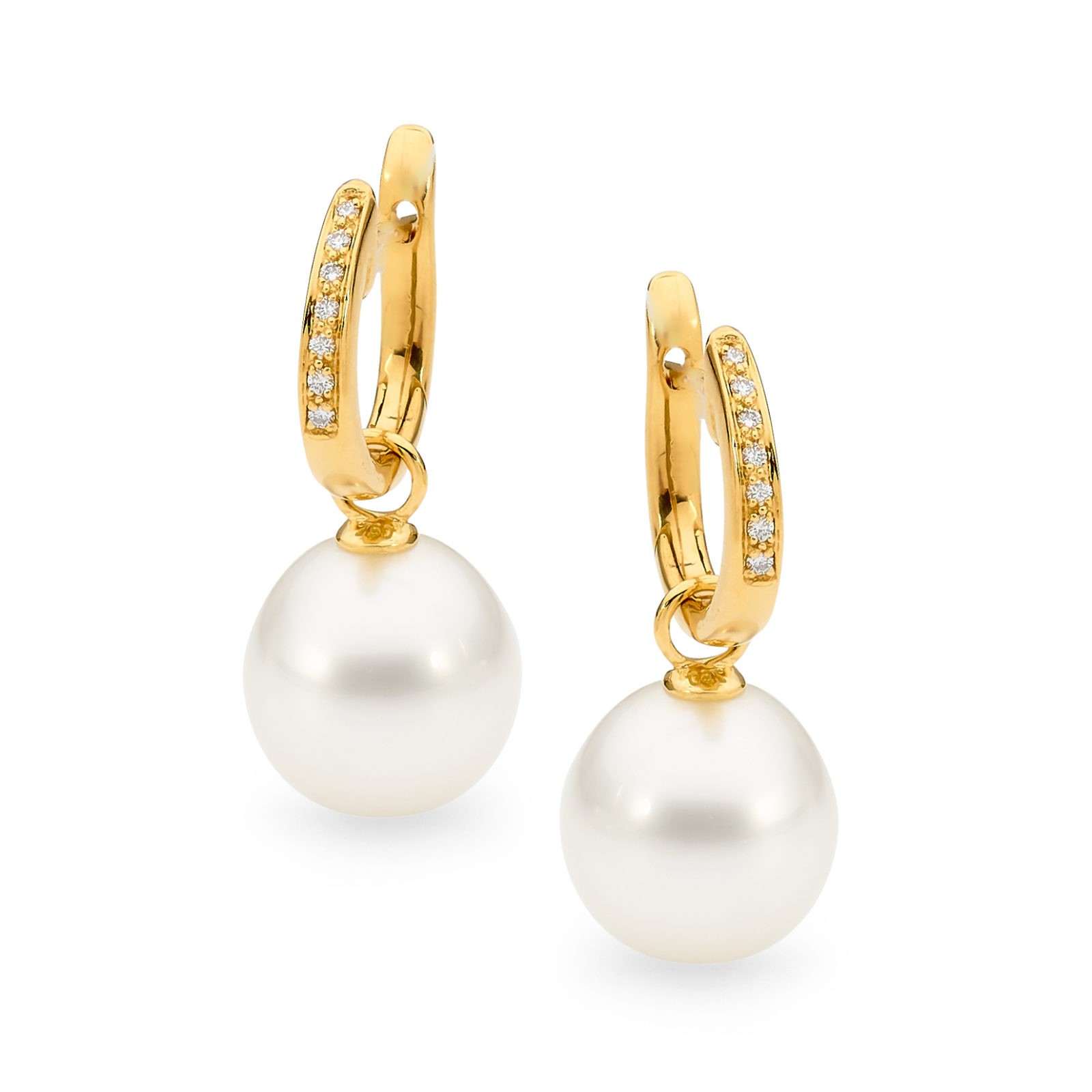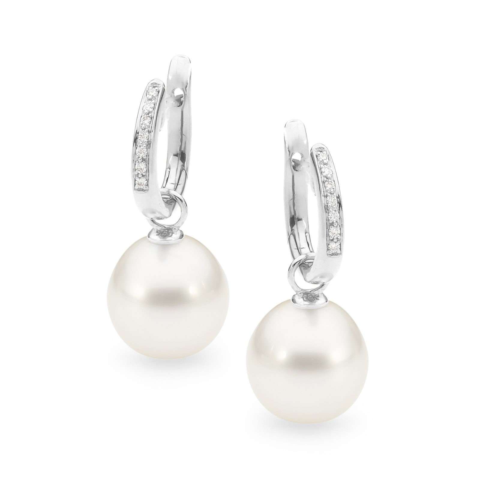 These detachable pearl earrings are set in 18ct yellow or white gold and feature 14=0.07ct G/SI white diamonds and a pair of lustrous 11-12mm oval/drop white South Sea pearls.