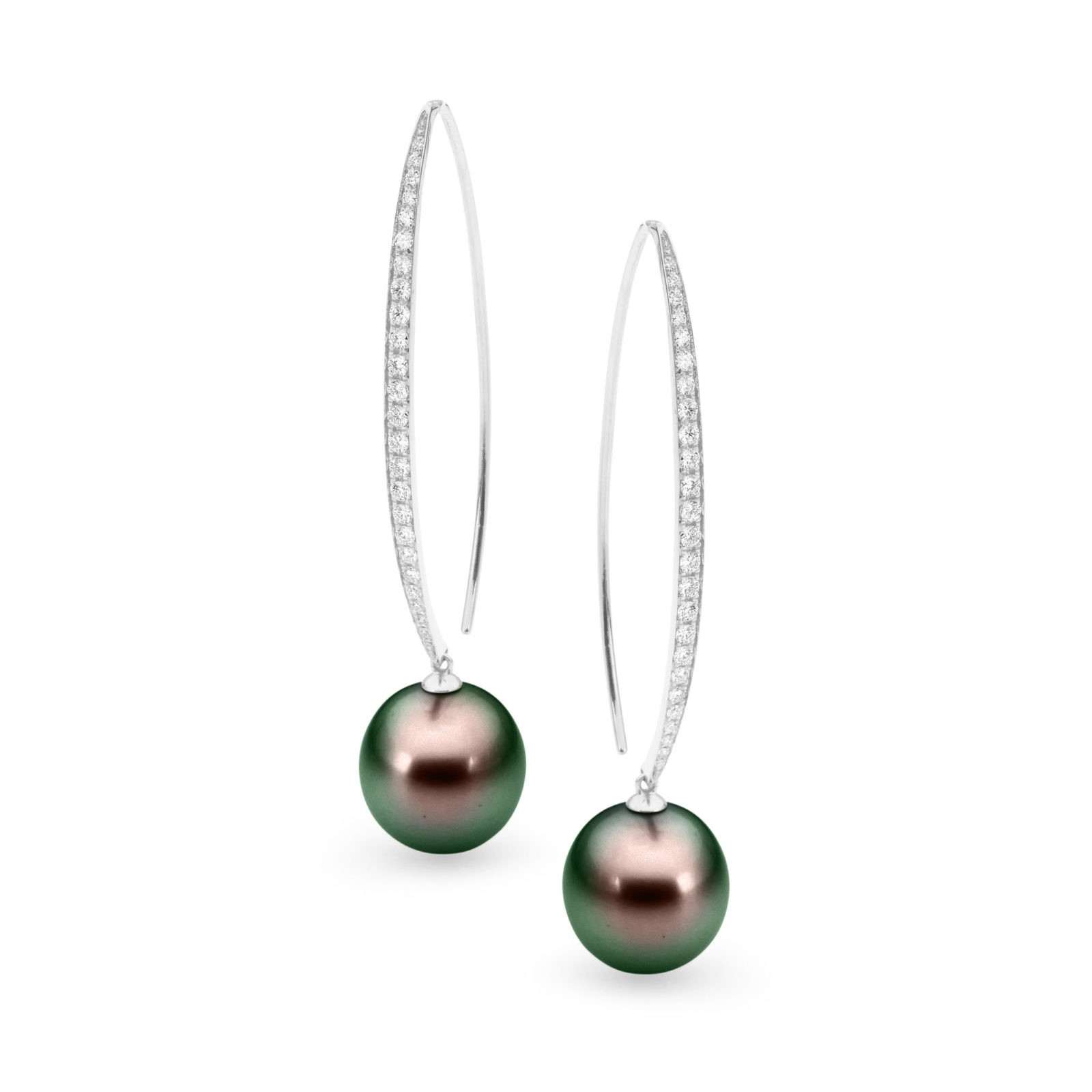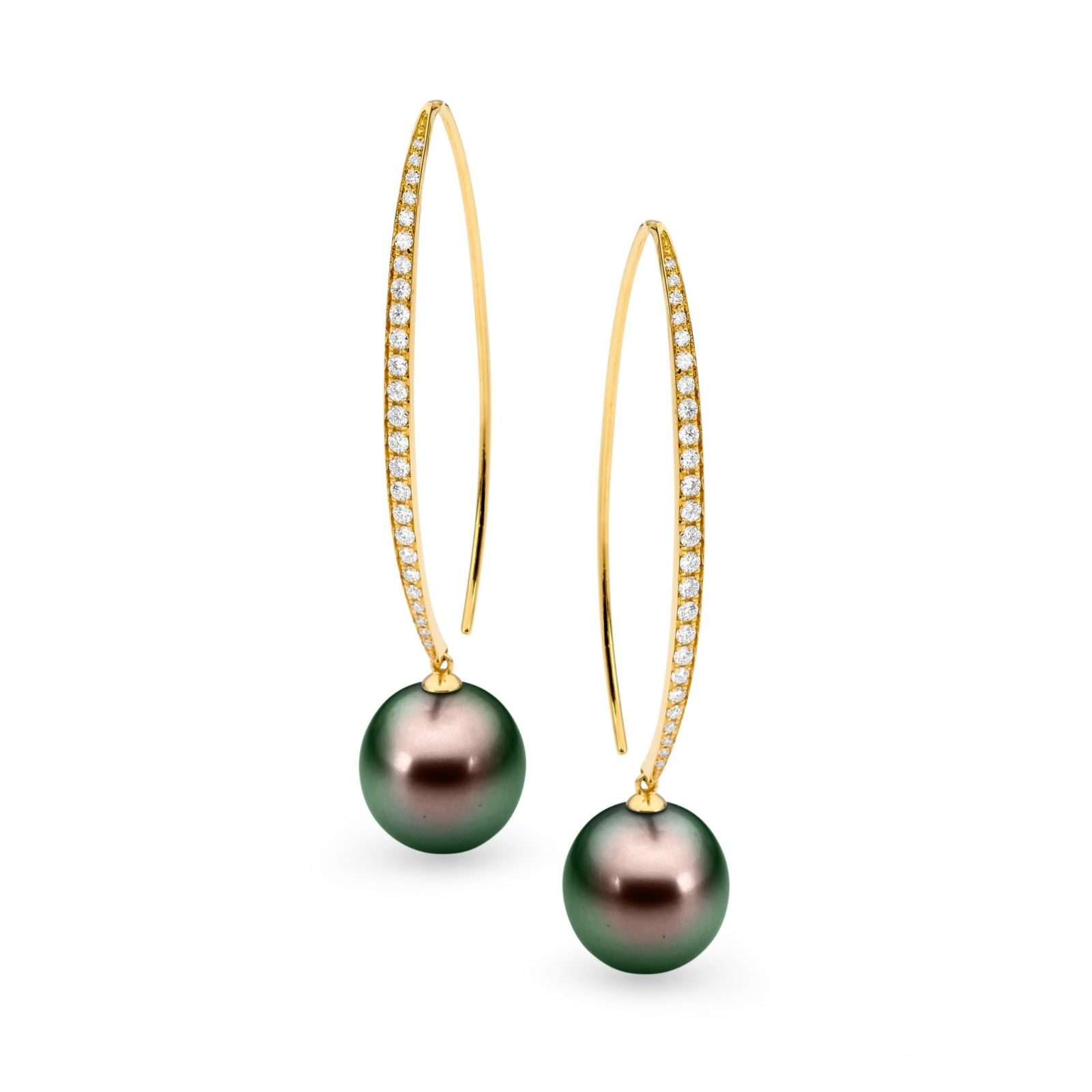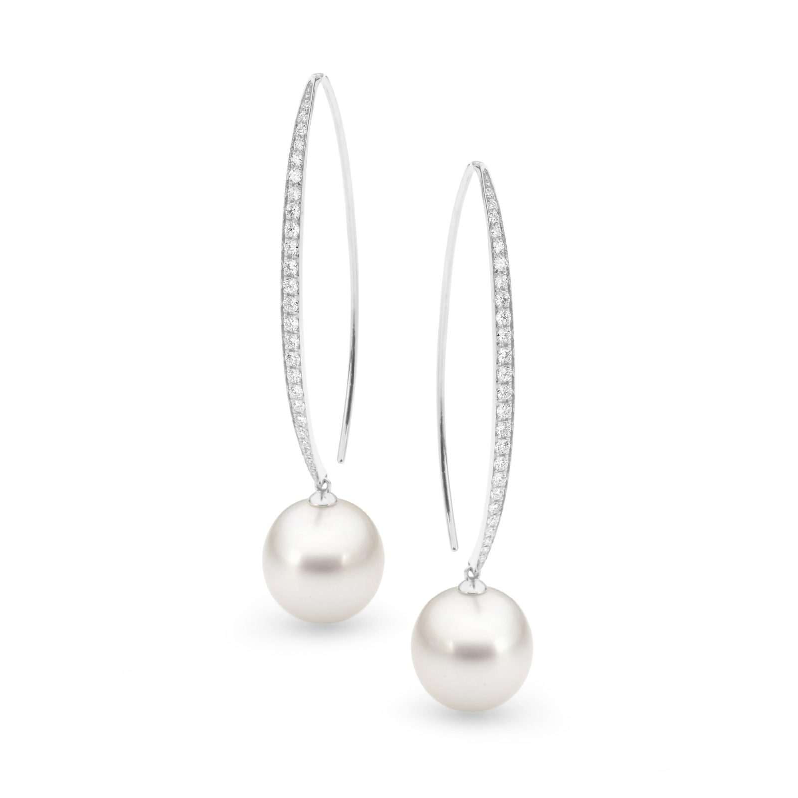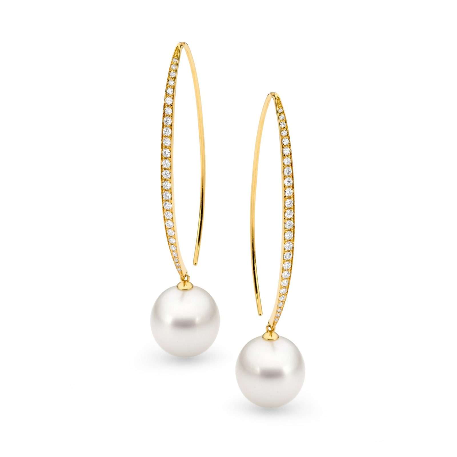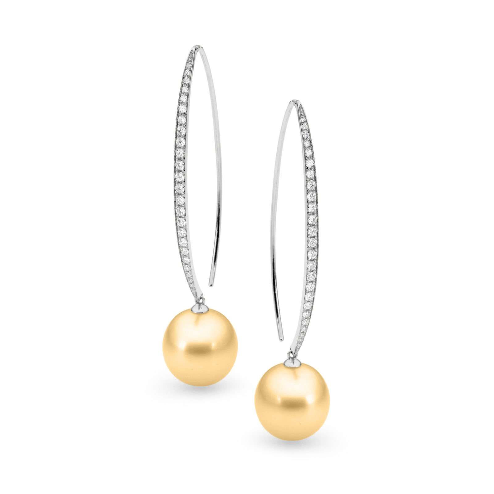 Set in 18ct gold, these stunning earrings feature pavé set diamonds (=0.53ct G/SI) and a lustrous pair of 12-13mm oval/drop South Sea pearls. Available in 18ct yellow or white gold, with three pearl colour variations.
