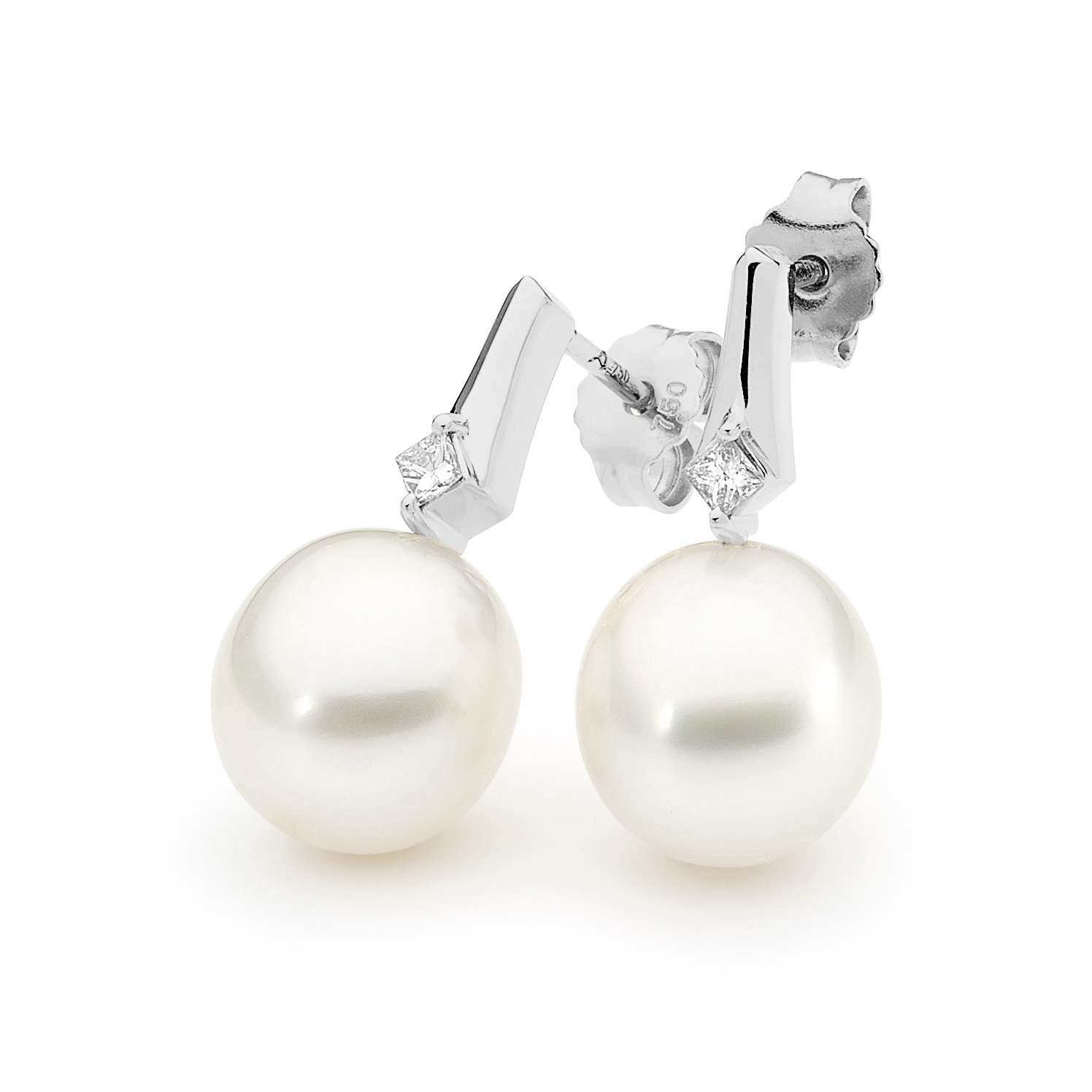 These classic earrings are set in 18ct white gold and feature a lustrous pair of 10-11mm white South Sea oval/drop cultured pearls and 2=0.10ct G/SI diamonds.