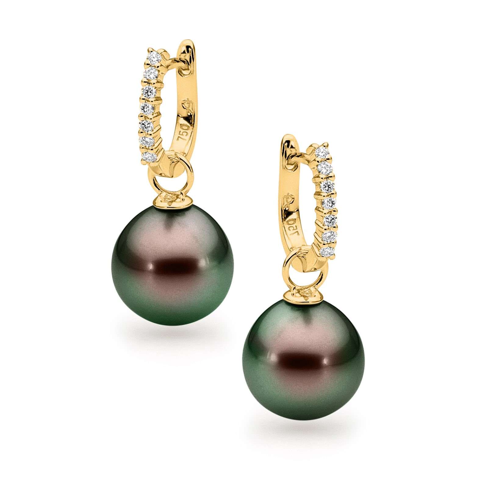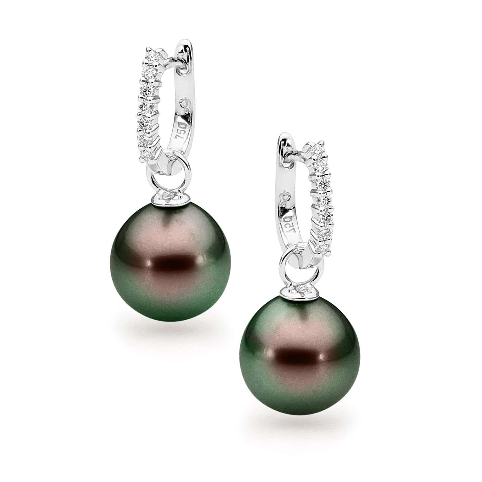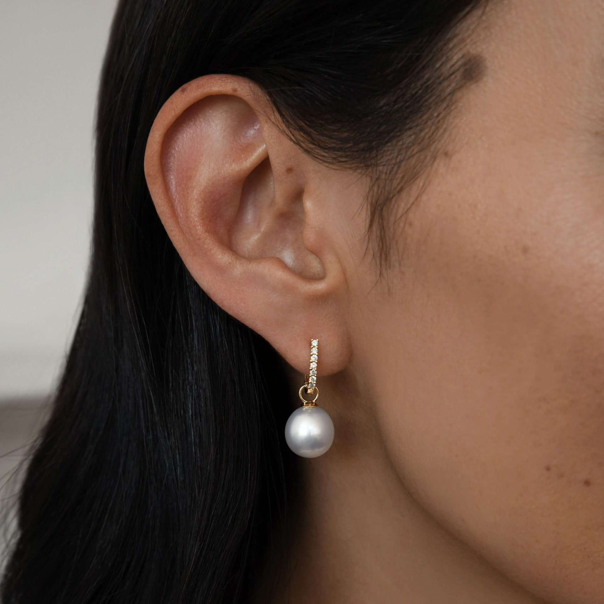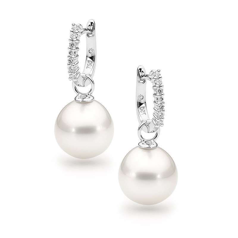 These dazzling detachable huggie earrings are set in 18ct gold and feature 14=0.14ct G/SI claw set white diamonds and a pair of lustrous 10-11mm oval drop South Sea pearls. Available in 18ct white or yellow
