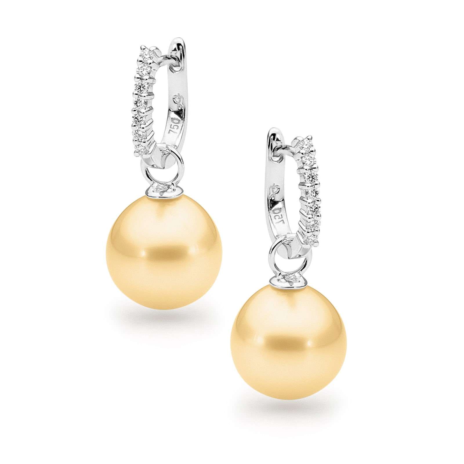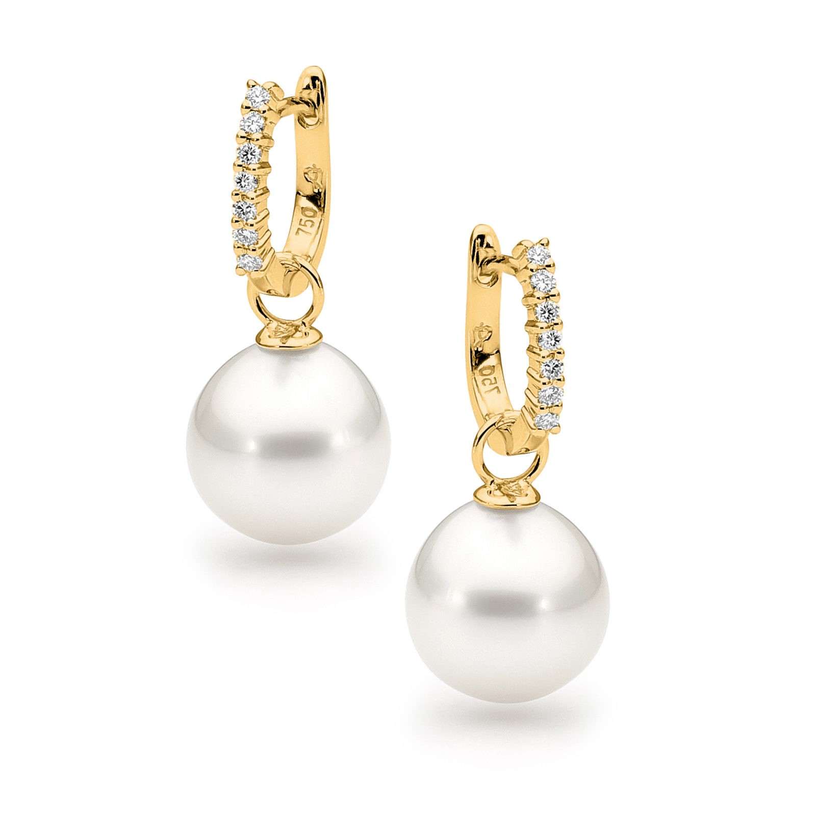These dazzling detachable huggie earrings are set in 18ct gold and feature 14=0.14ct G/SI claw set white diamonds and a pair of lustrous 10-11mm oval drop South Sea pearls.