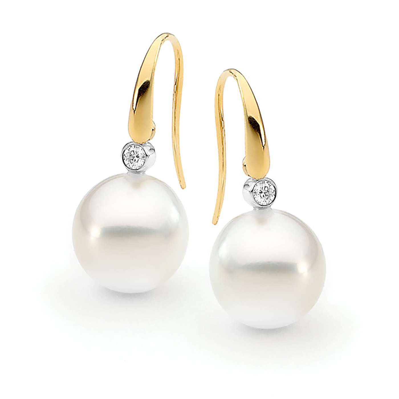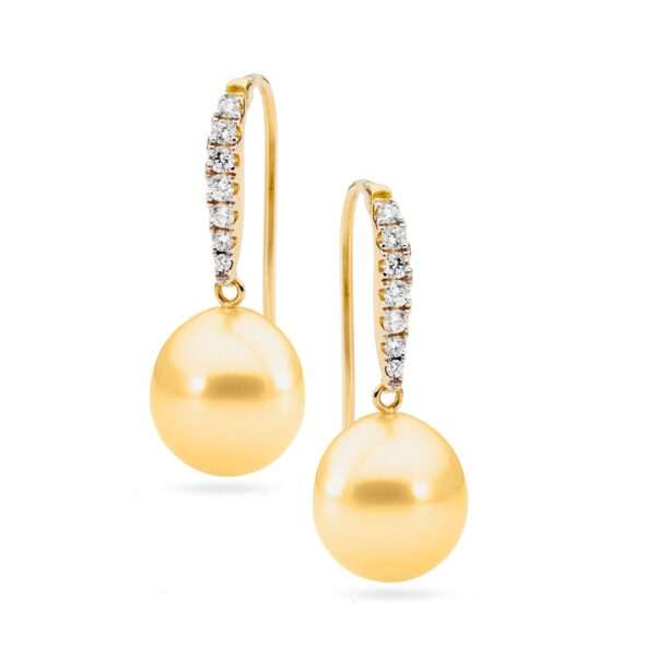 This beautiful pair of articulated 18ct gold French hook style earrings features a lustrous pair of oval drop shaped South Sea pearls and 2=0.09ct G/SI round brilliant cut diamonds in bezel settings. Available in 18ct