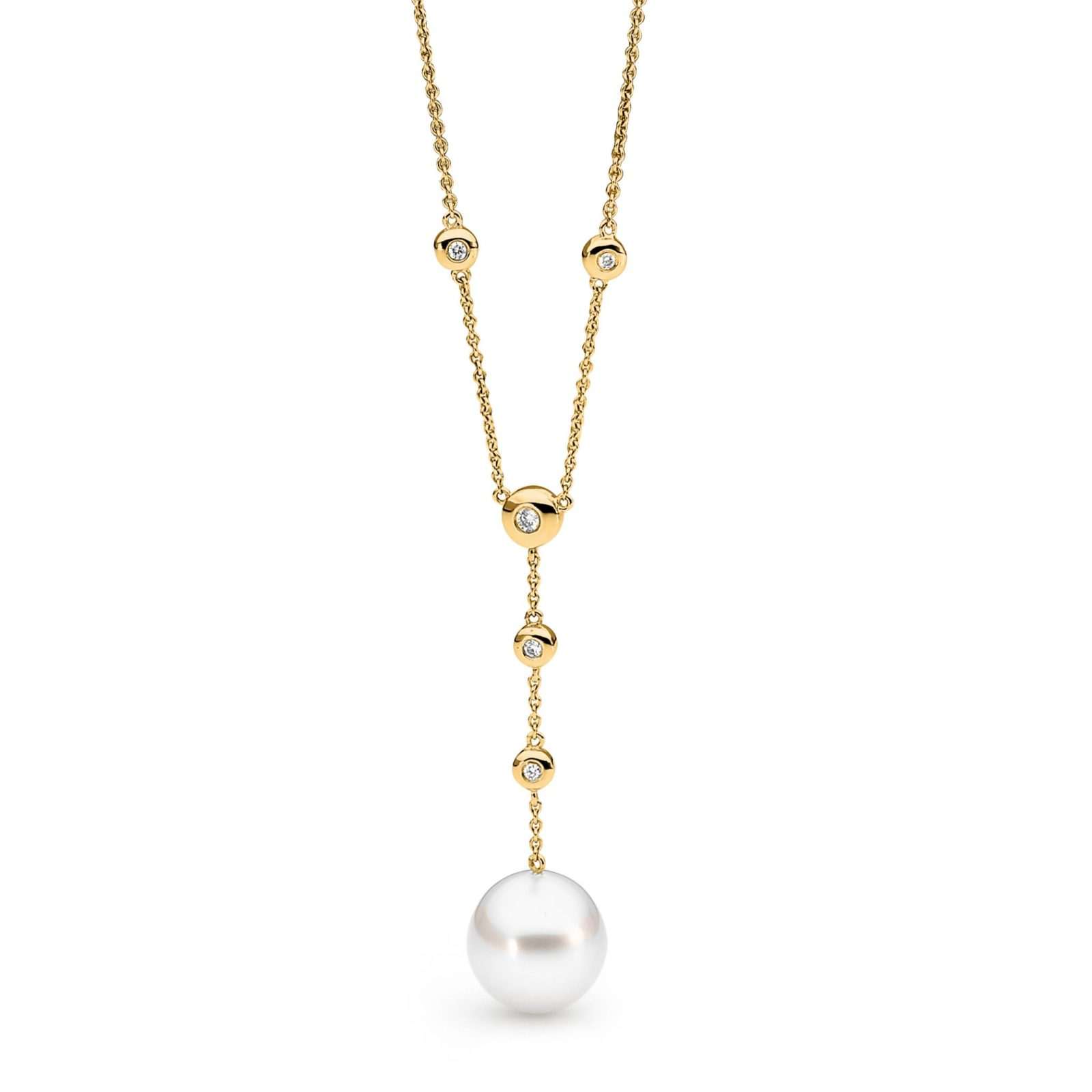 This pendant is set in 18ct yellow gold, featuring white (0.19ct) diamonds and a lustrous 11-12mm oval/drop white South Sea pearl. (Chain is included).