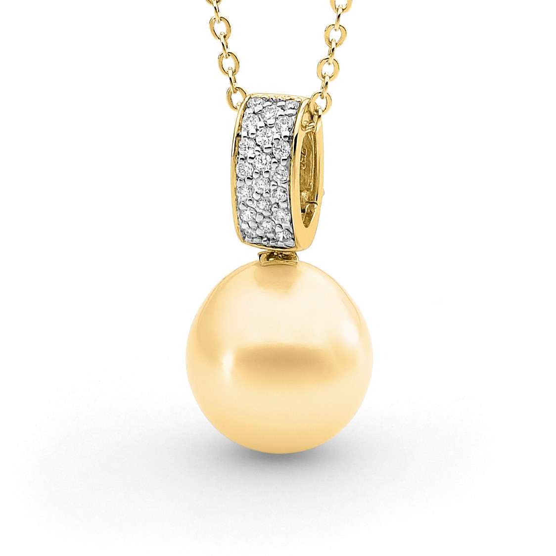 Set in 18ct gold, this pavé diamond hinged enhancer pendant features a lustrous 13-14mm oval/drop South Sea cultured pearl and 20=0.20ct G/SI pavé set diamonds. Available in 18ct yellow or white gold, with three pearl