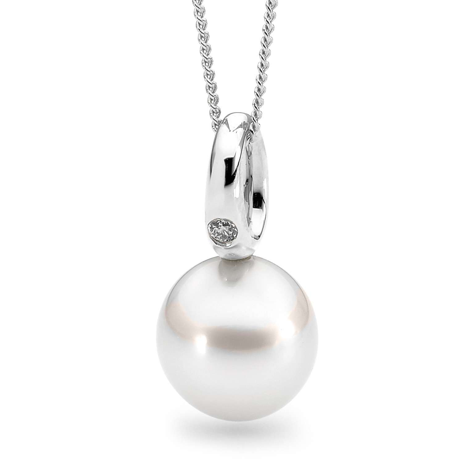 Set in 18ct gold, this pendant features a singular bezel set diamond (0.04ct G/SI) and a lustrous 11-12mm white oval/drop South Sea pearl. Please select your desired metal colour below. (Chain is for display purposes