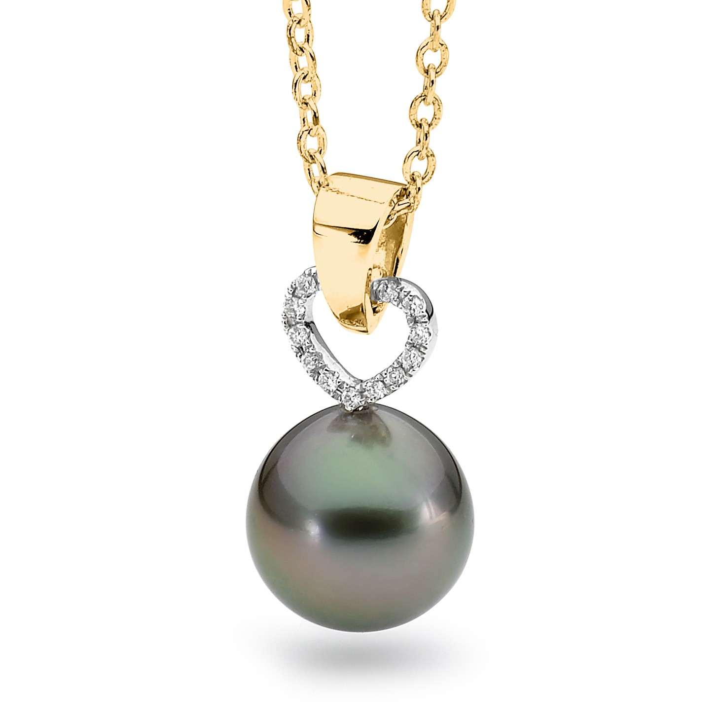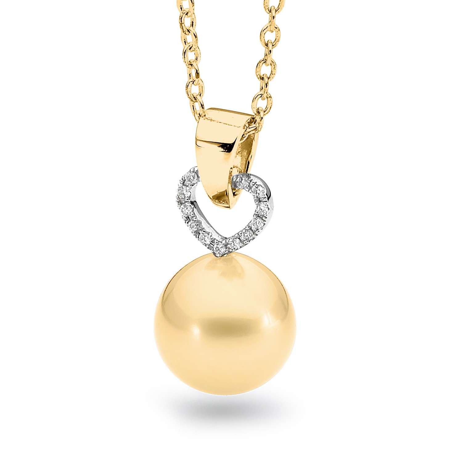 Say it with love. This pendant is set in 18ct yellow gold and features a lustrous 10-11mm oval/drop South Sea cultured pearl and 13=0.07ct G/SI diamonds. Please select your desired pearl colour from the drop-down