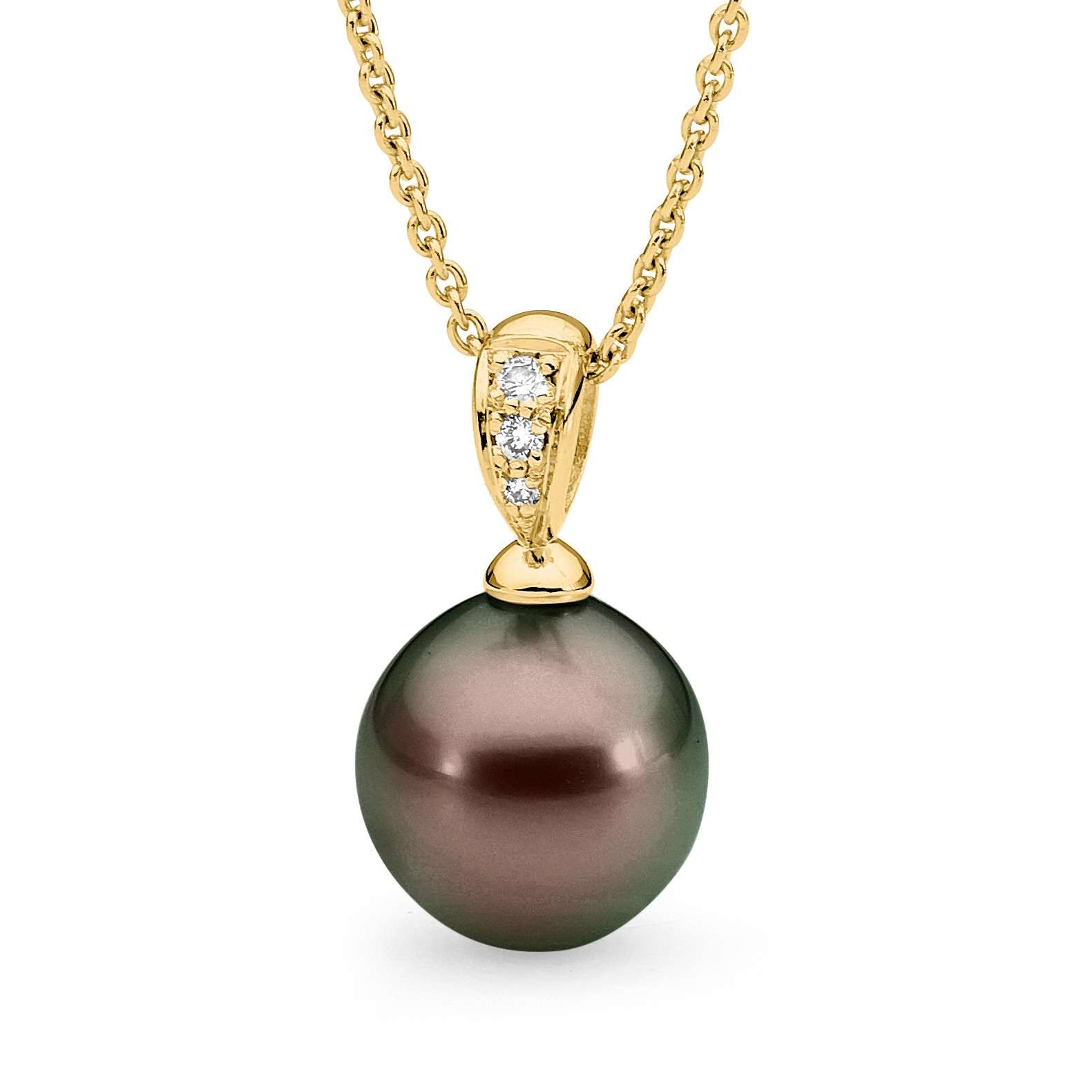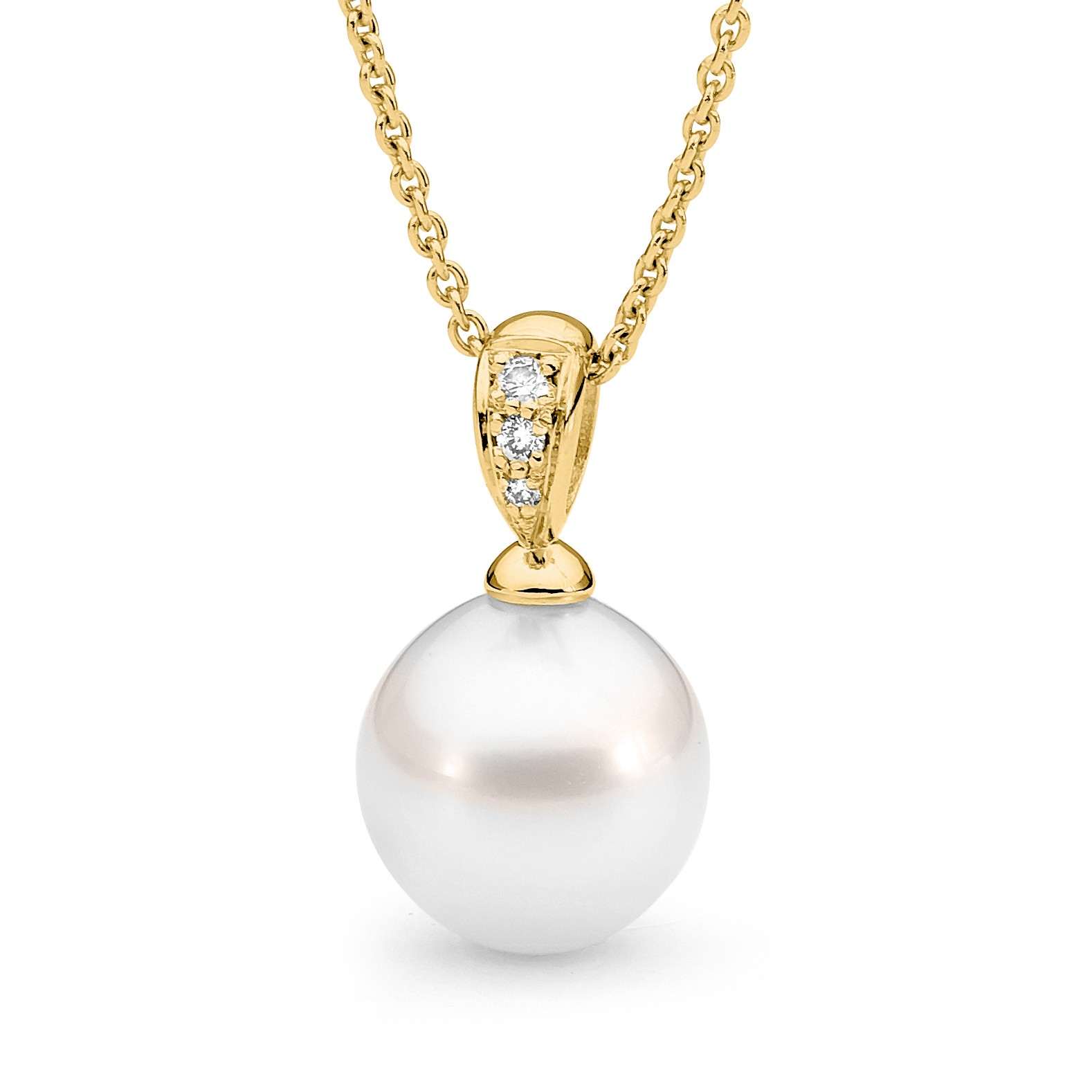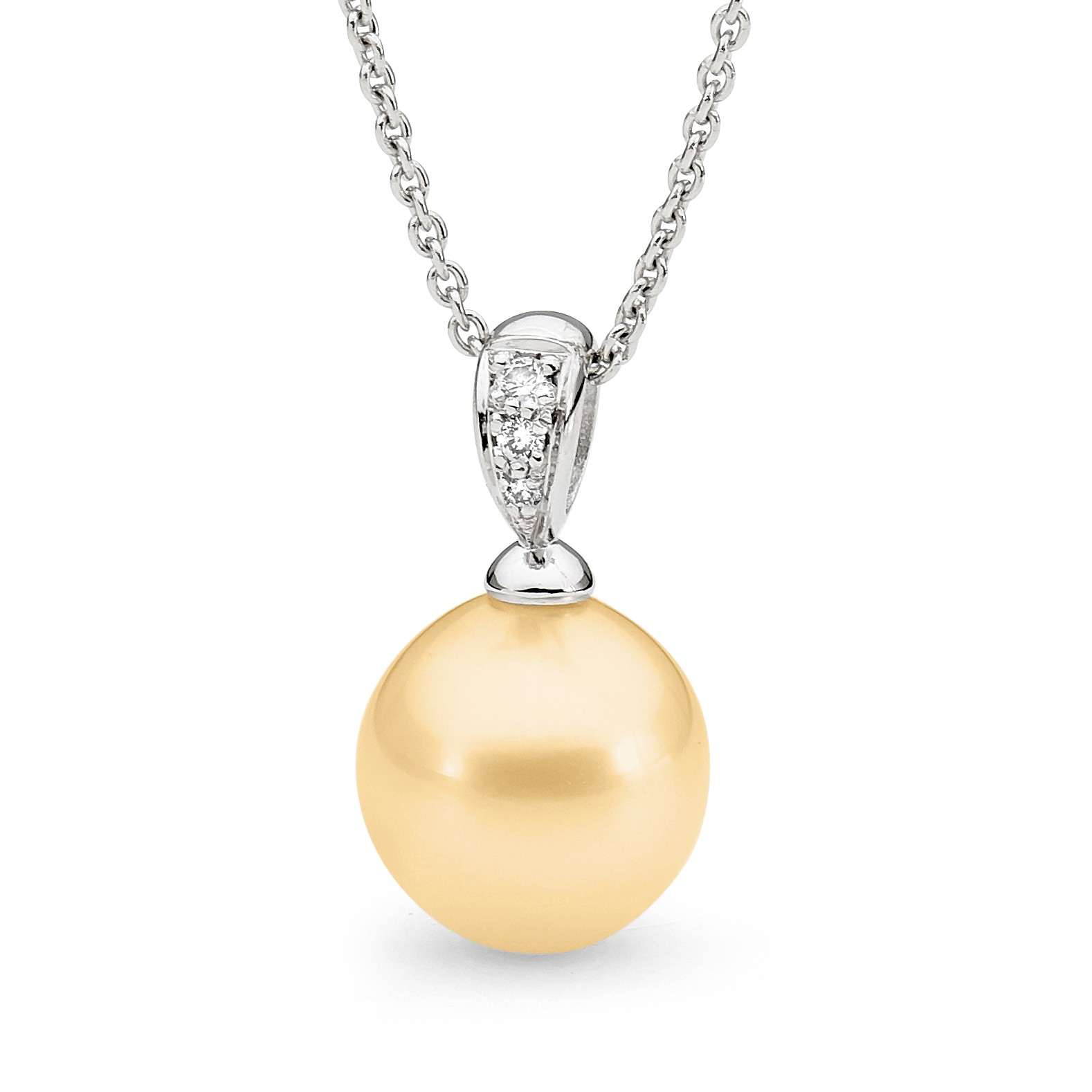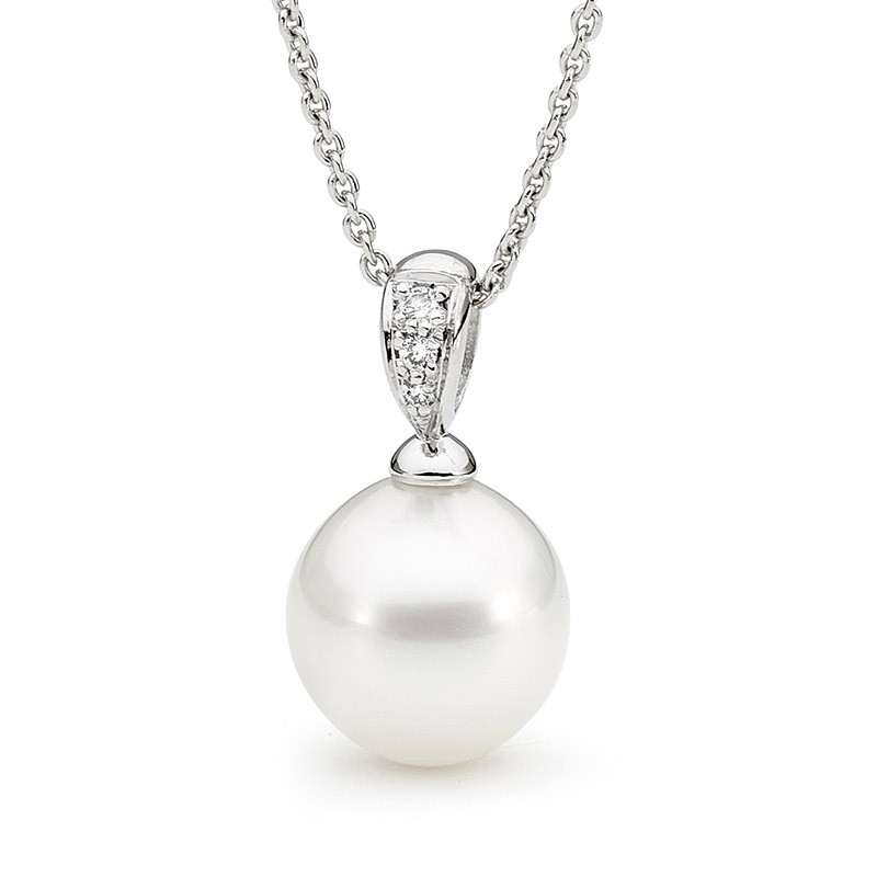 Set in 18ct gold, this pendant features a diamond set bale (3=0.06ct G/SI) and one 12-13mm oval/drop South Sea pearl. Available in 18ct yellow or white gold, with three pearl colour variations. Please select your