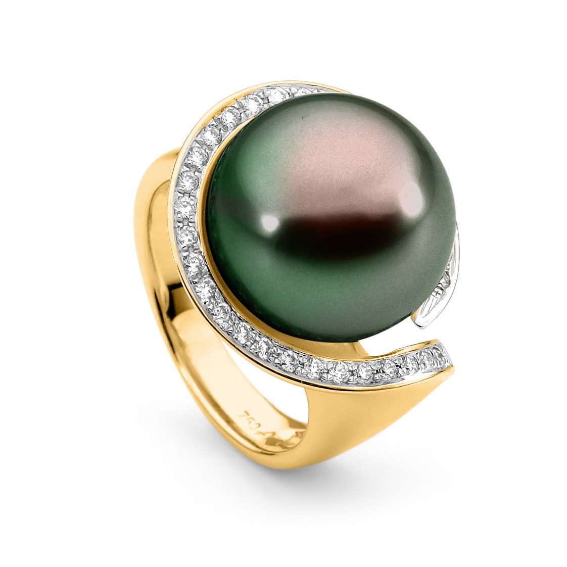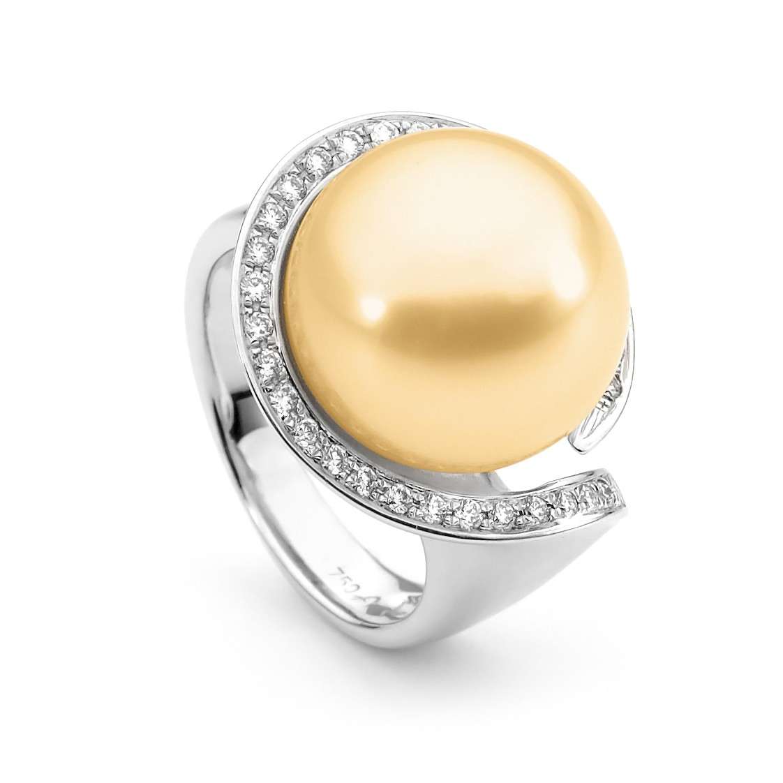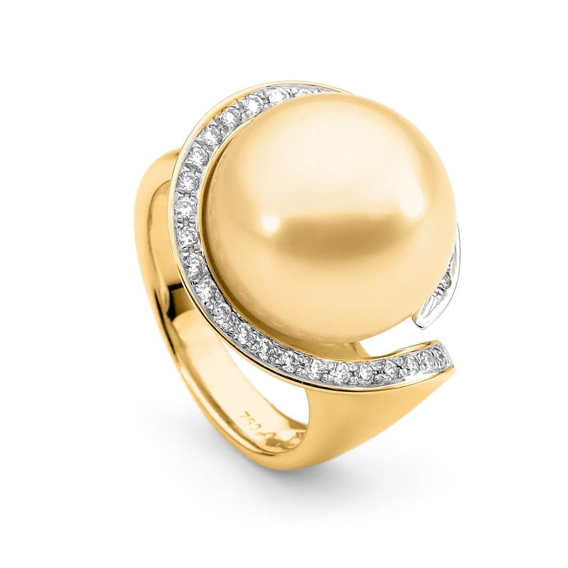This glamorous ring is set in 18ct yellow or white gold, and features 31=0.24ct G/SI diamonds and a lustrous 14-15mm South Sea cultured button pearl.