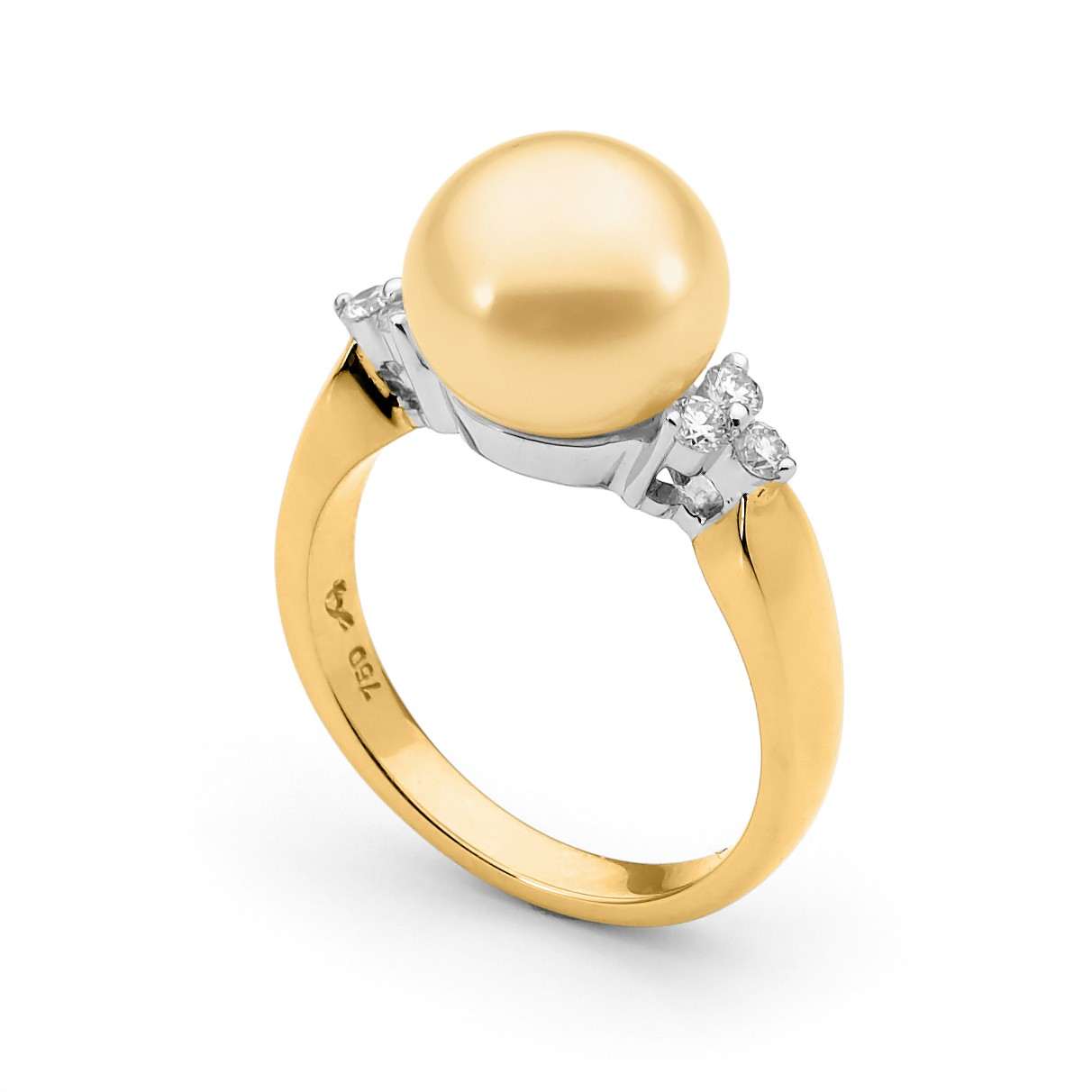 This lovely ring is set in 18ct gold, featuring a trio of white (3=0.10ct) diamonds either side totalling (6=0.20) and a lustrous 10-11mm button white South Sea pearl.