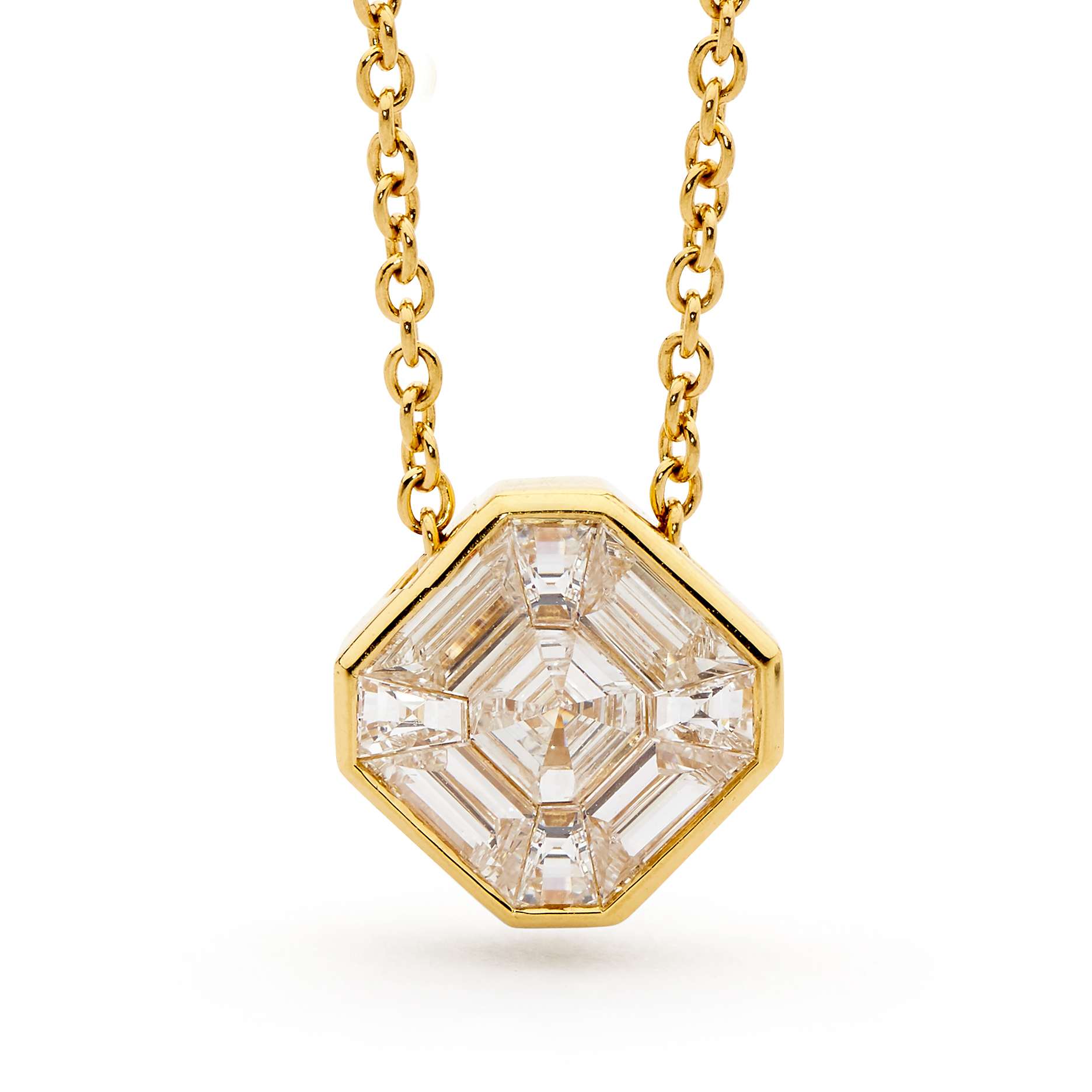 Set in 18ct yellow gold, this slider pendant features 9=0.53ct Magic Ascher Cut Diamonds (G+/VS-SI) on an 18ct yellow gold 45cm fine trace chain.