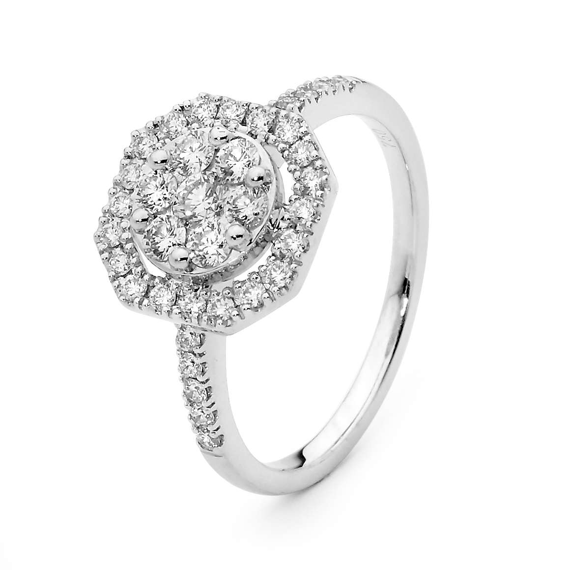 Set in 18ct white gold, this stunning diamond (0.74ct) ring features a cluster of 7 round brilliant cut diamonds (GH/SI) at the center, surrounded by a halo and set on a band of sparkling diamonds.