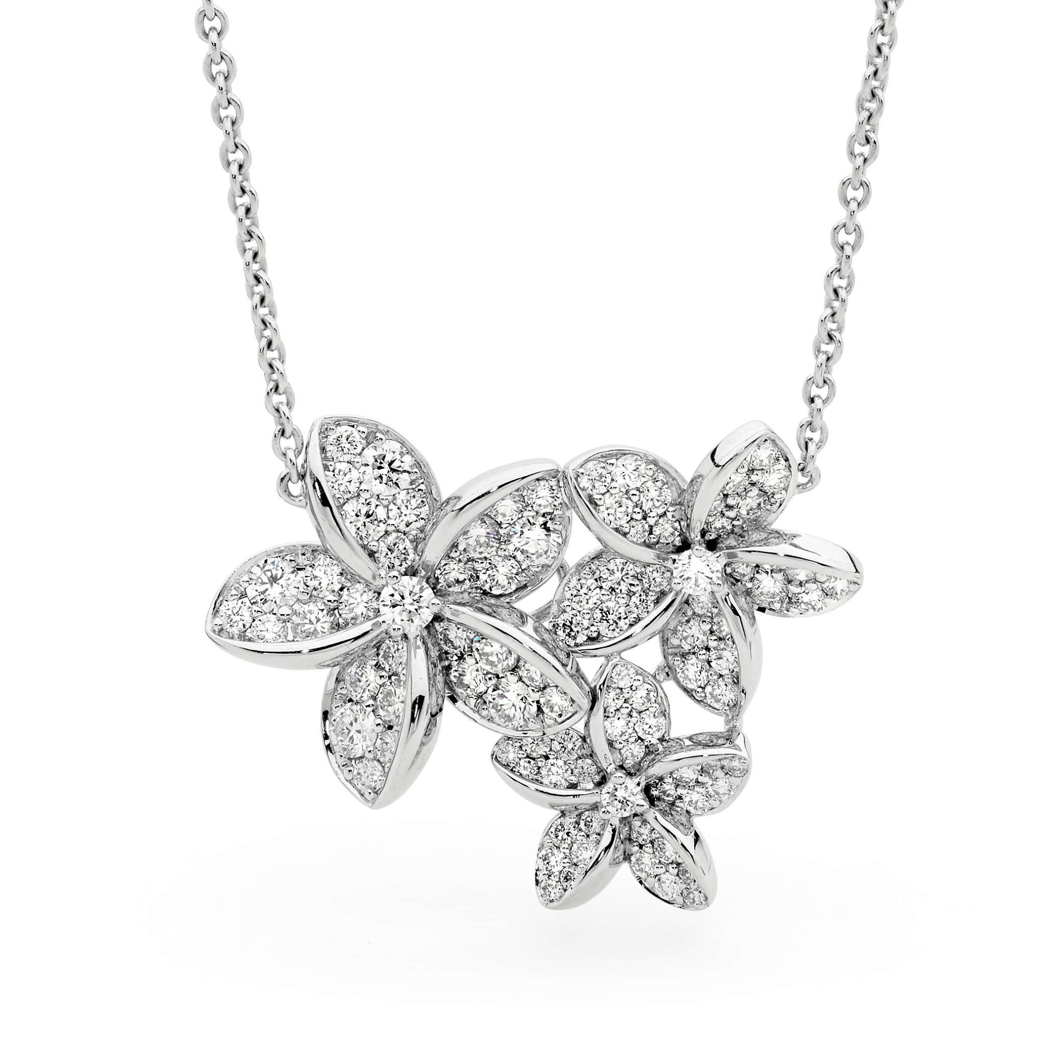 Crafted in 18ct white gold, this beautiful diamond flower pendant is set with 93=1.10ct G/VS round brilliant cut diamonds.