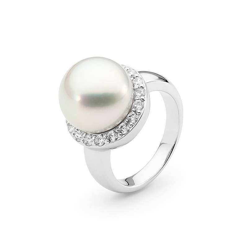 Set in 18ct gold, this ring features a lustrous 12-13mm button shaped cultured South Sea pearl, surrounded by a sparkling full-circle halo of 18=0.61ct G/SI) round brilliant cut diamonds.