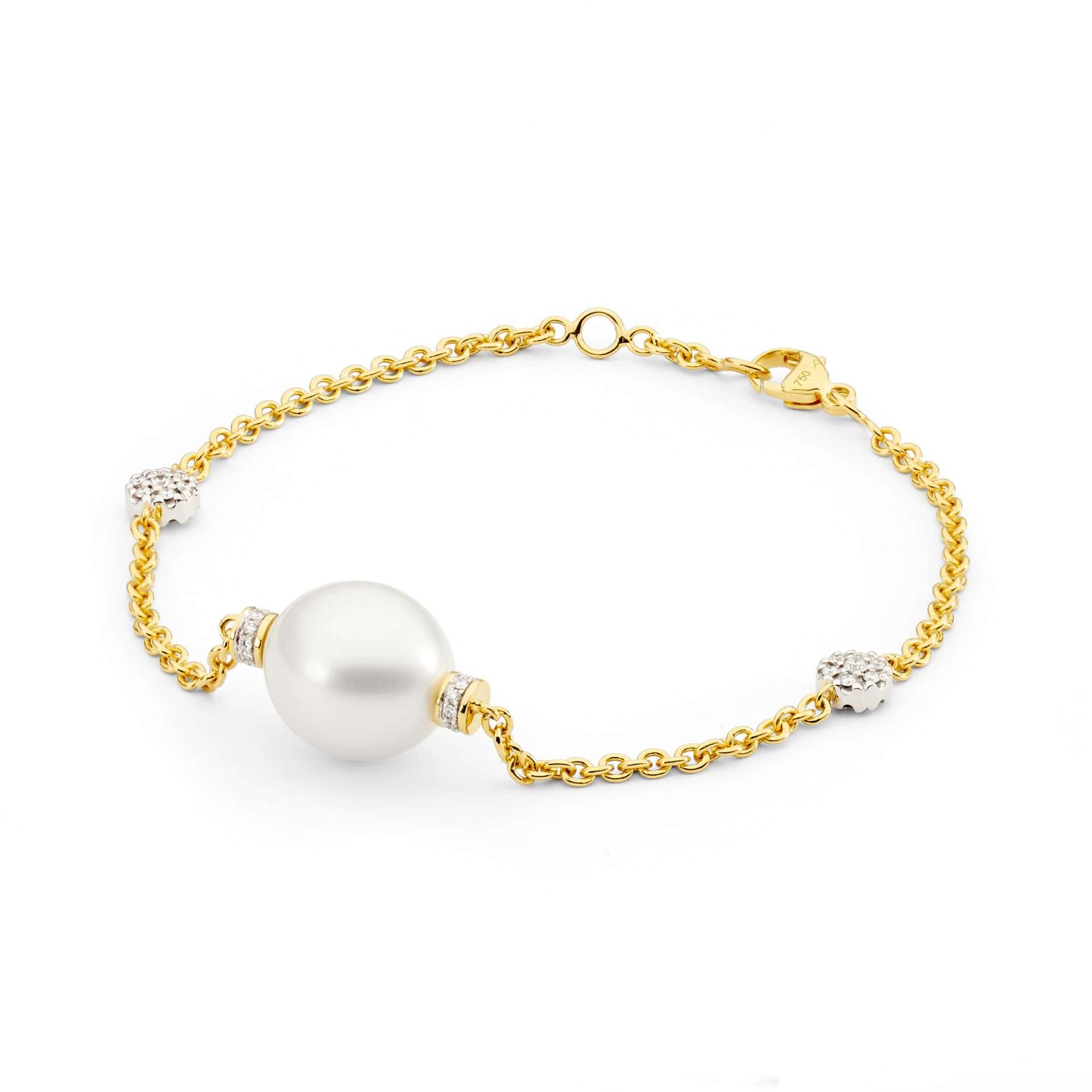This 18ct yellow & white gold bracelet features a 12.4mm oval Australian South Sea cultured pearl fixed with 2x grain set diamond rondels & adorned with 2x double sided floating diamond set halos (48=0.35 G/SI).