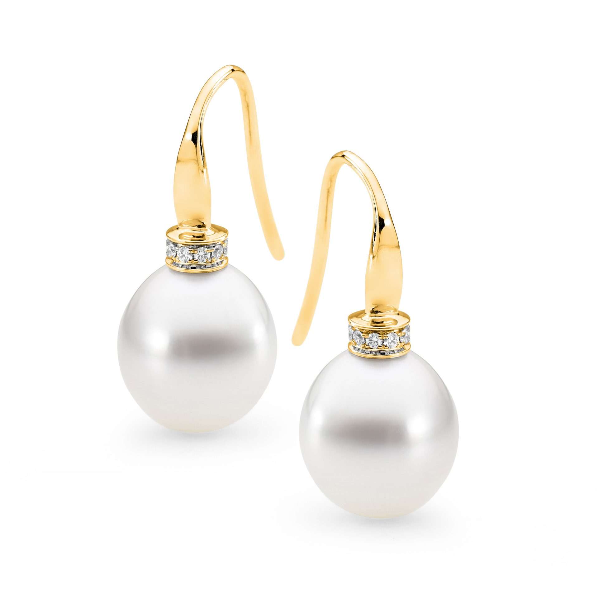 These timeless French hook earrings are crafted in 18ct yellow or white gold and feature 20=0.10ct round brilliant diamonds which perfectly compliment a pair of 10-11mm oval/drop South Sea cultured pearls.