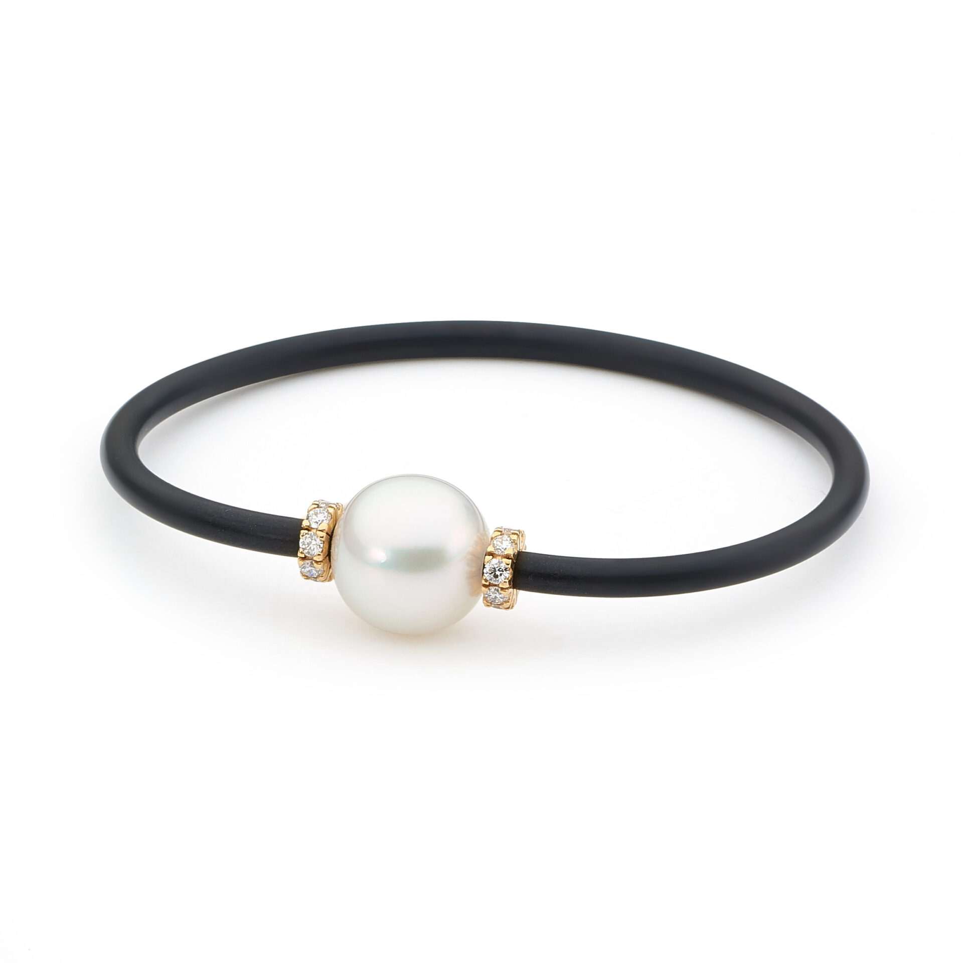 An elevated twist on the classic South Sea pearl neoprene bangle, this stunning piece features two elegant diamond (16=0.50ct G/SI) Rondell’s, set in 18ct yellow gold, and placed on either side of one lustrous 11-12mm
