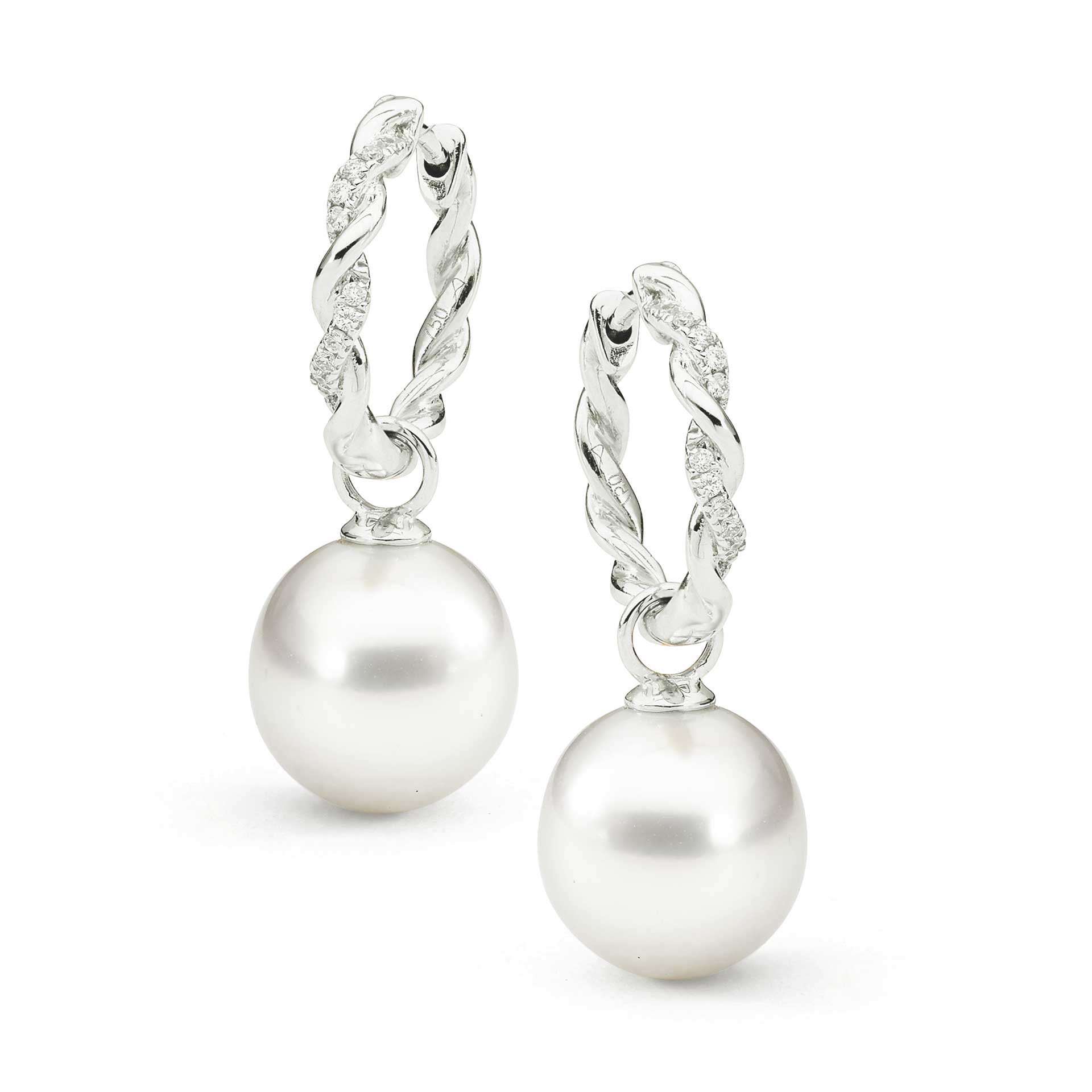 These stunning earrings are set in 18ct white gold and feature 24=0.08ct G/SI diamonds and a lustrous pair of white 10-11mm oval/drop South Sea pearls.
