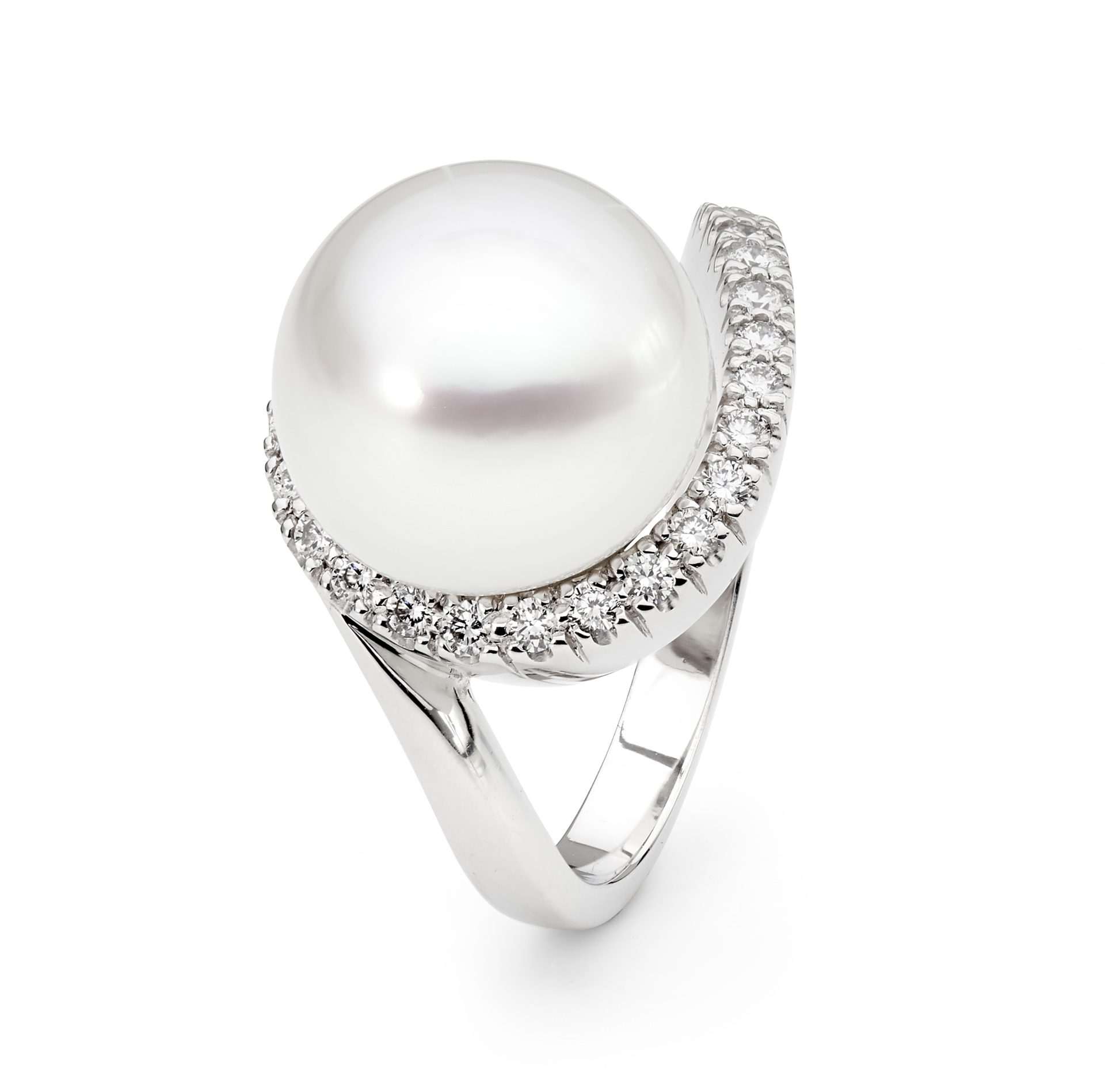 Set in 18ct yellow or white gold, this ring features a lustrous 12-13mm button shaped South Sea cultured pearl, and includes 25 round brilliant cut diamonds totalling 0.375ct (G/SI).