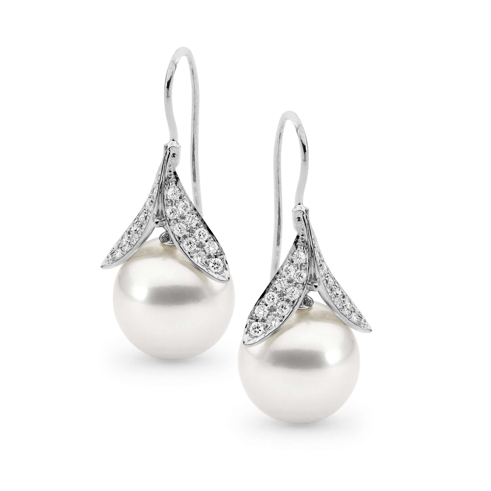Inspired by lush foliage of the Broome wet season, the Diamond Tropical Summer Earrings are elegantly crafted in 18ct gold, set with 40=0.40ct G/SI white round brilliant cut diamonds, and a pair of lustrous 12-13mm white oval/drop South Sea cultured pearls.