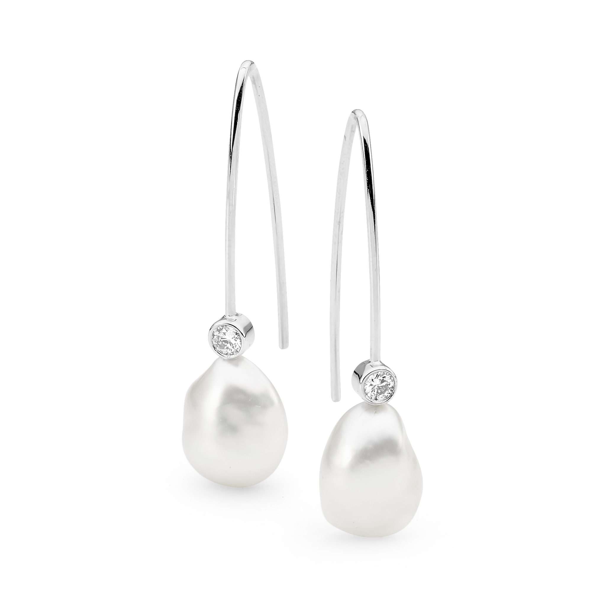 Set in 18ct white gold, these earrings feature two lustrous Australian South Sea keshi pearls (9.7×14.4mm) & include two 0.10ct G/SI rub-set diamonds. The organic, freeform shape of the keshi pearls may vary for each