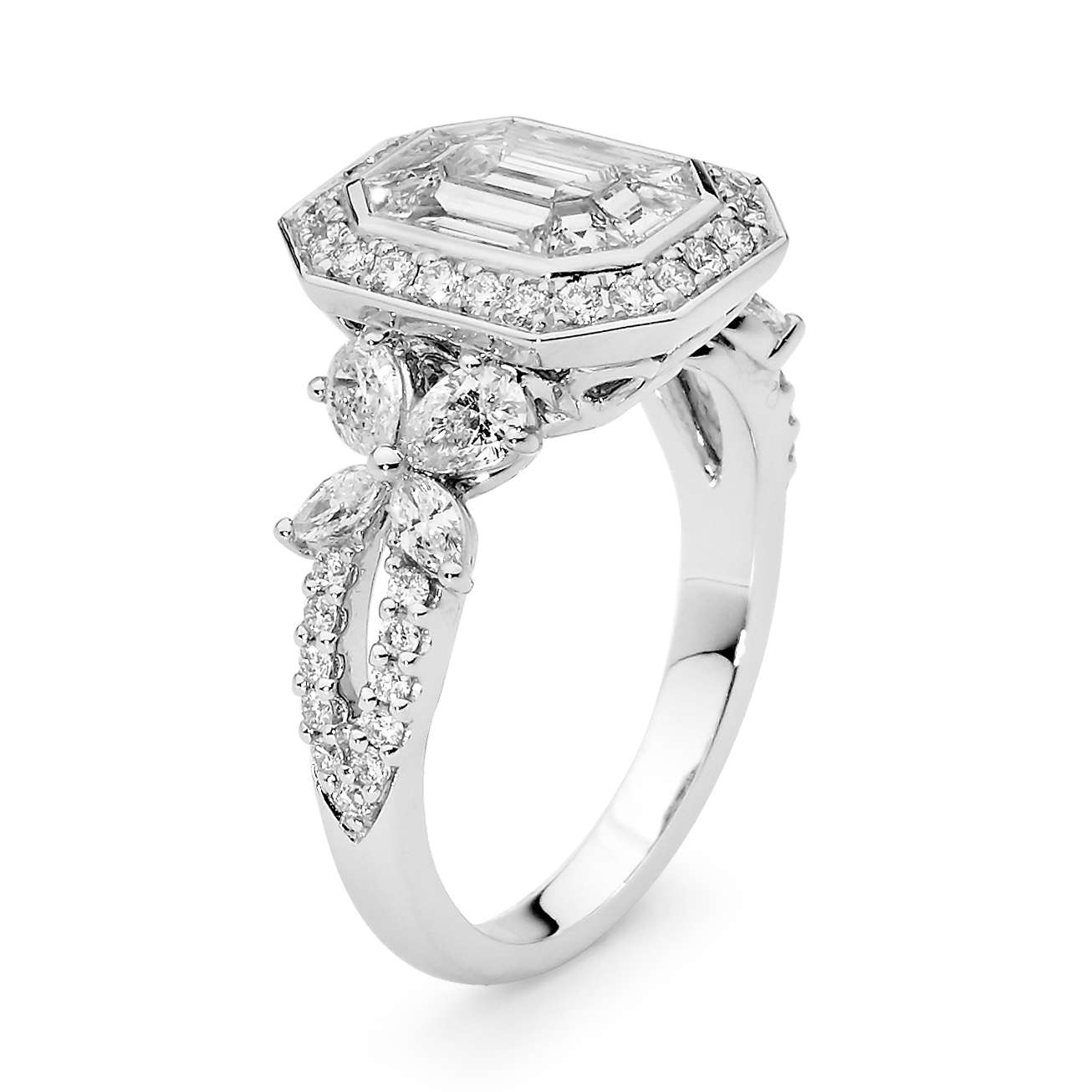 Set in 18ct white gold, this truly fabulous diamond ring features one (0.88ct) emerald cut (G/VS-SI) centre stone, surrounded by 46 round brilliant cut diamonds (G/SI) totalling 0.43ct. Along the band to compliment the centre stone, the ring is finished by 4 stunning marquise diamonds (G/SI) totalling 0.04ct, and 4 pear diamonds (G/SI) totalling 0.12ct.