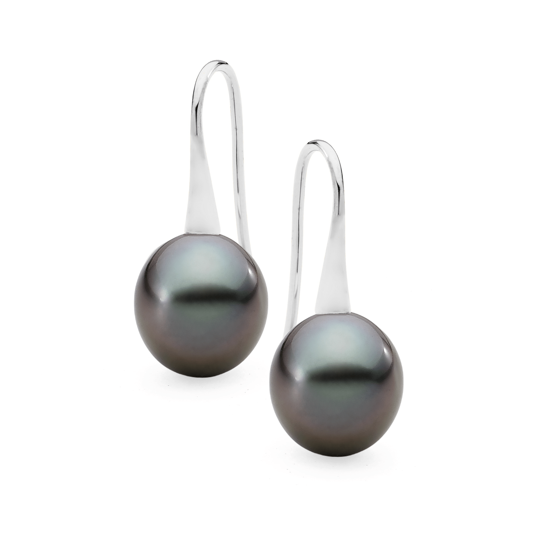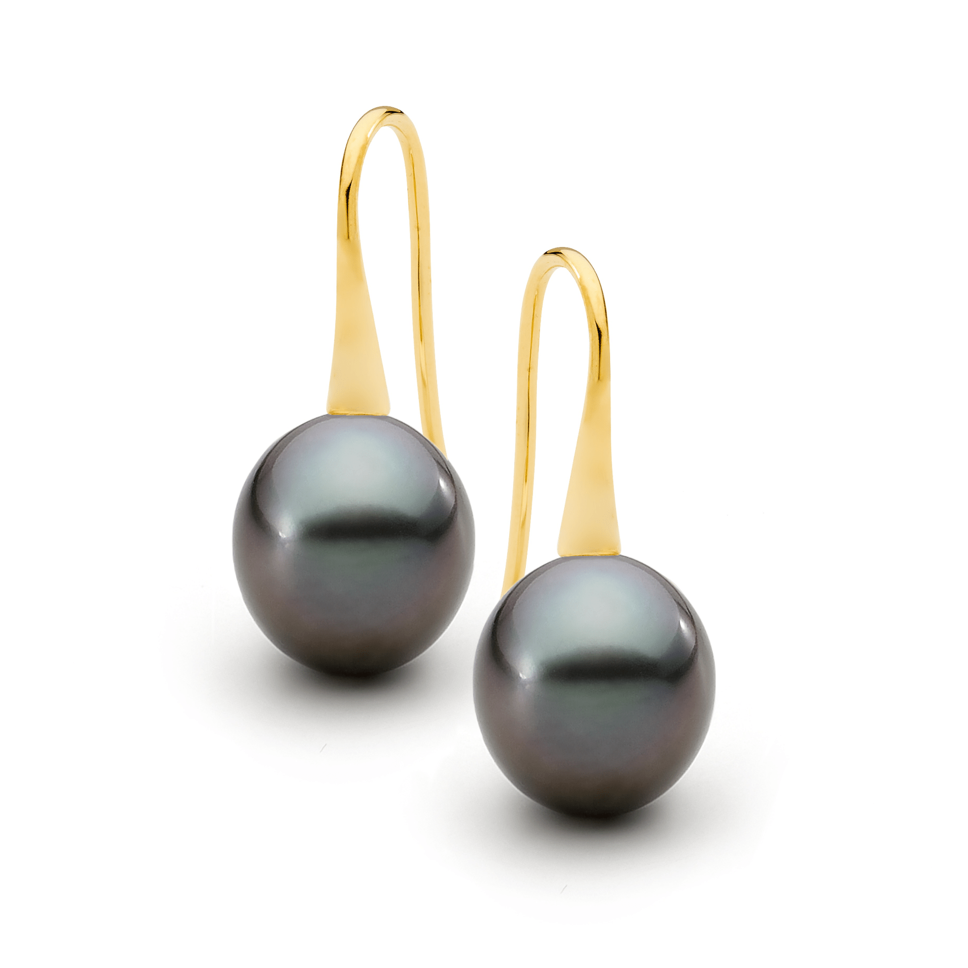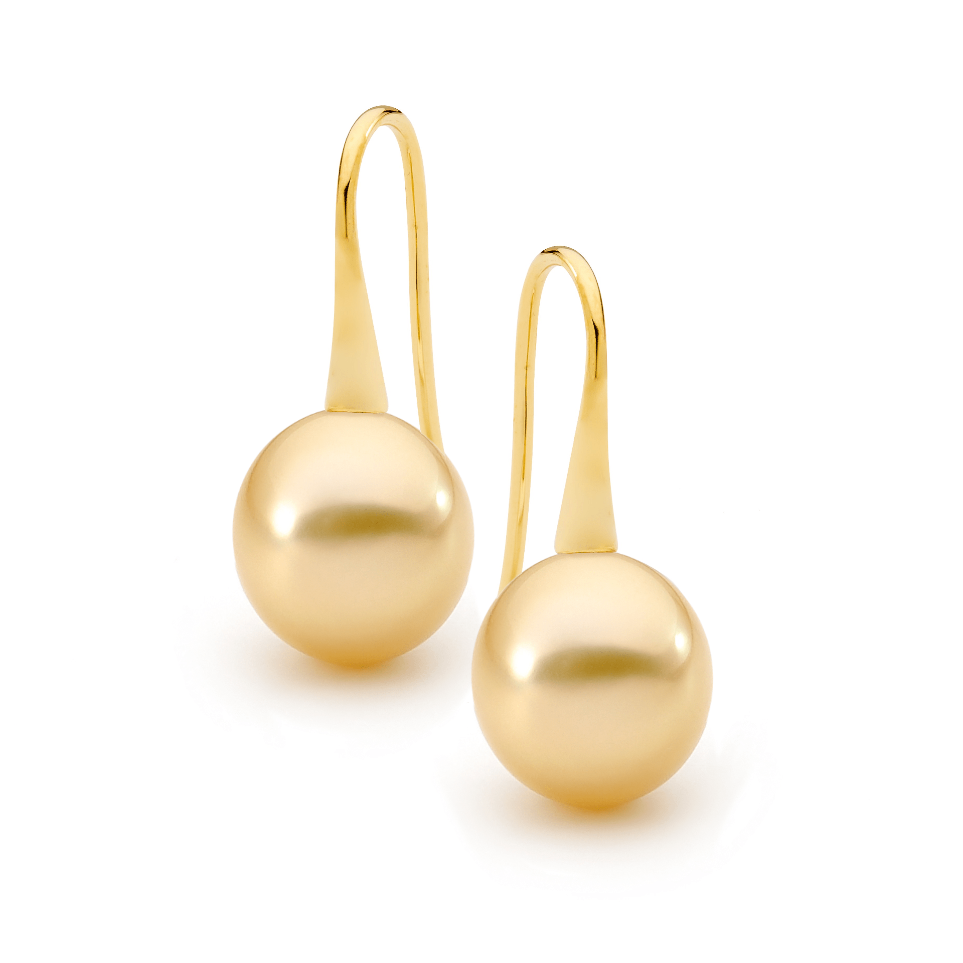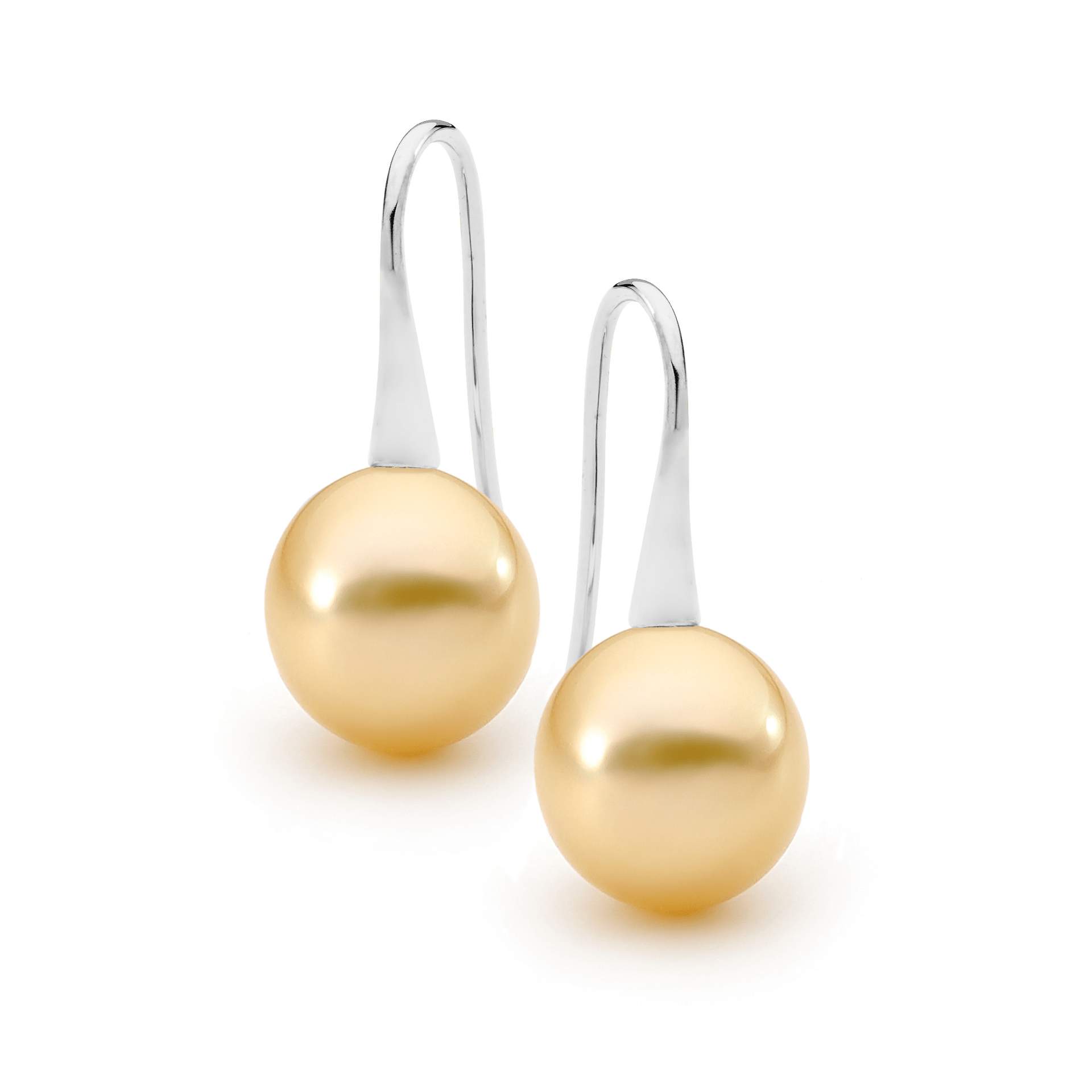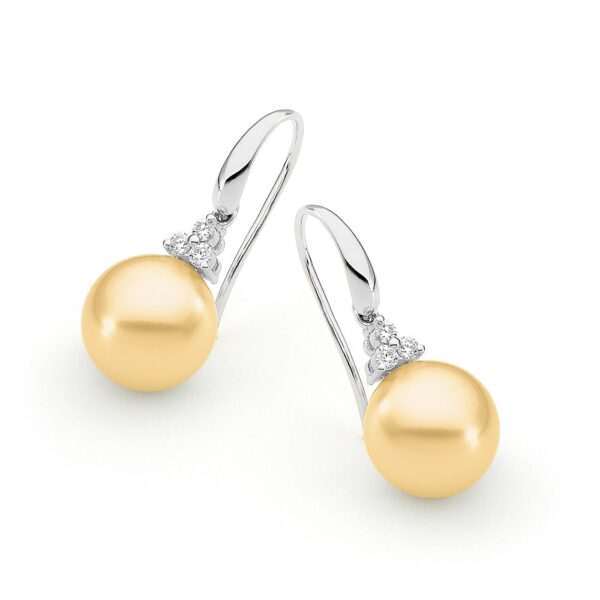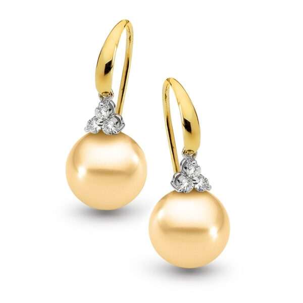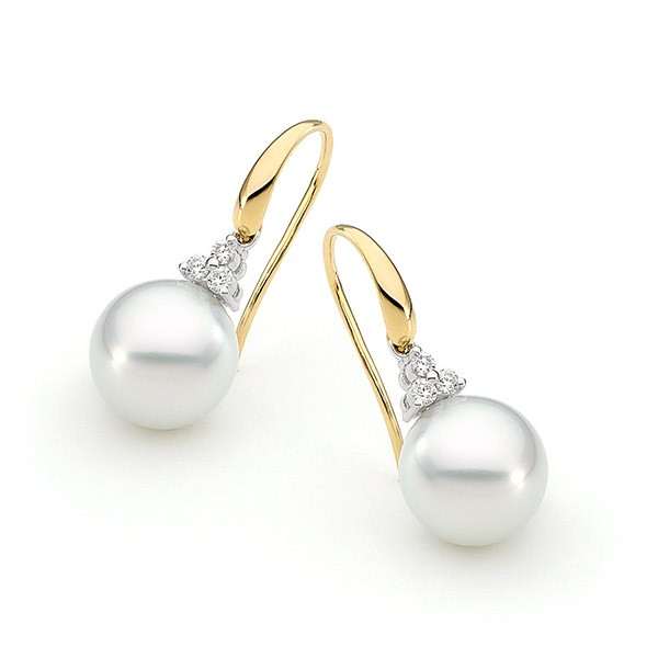 These trumpet style pearl earrings are set in 18ct yellow or white gold and feature a lustrous pair of 9-10mm oval/drop South Sea pearls. Available in 18ct yellow or white gold, with three pearl colour