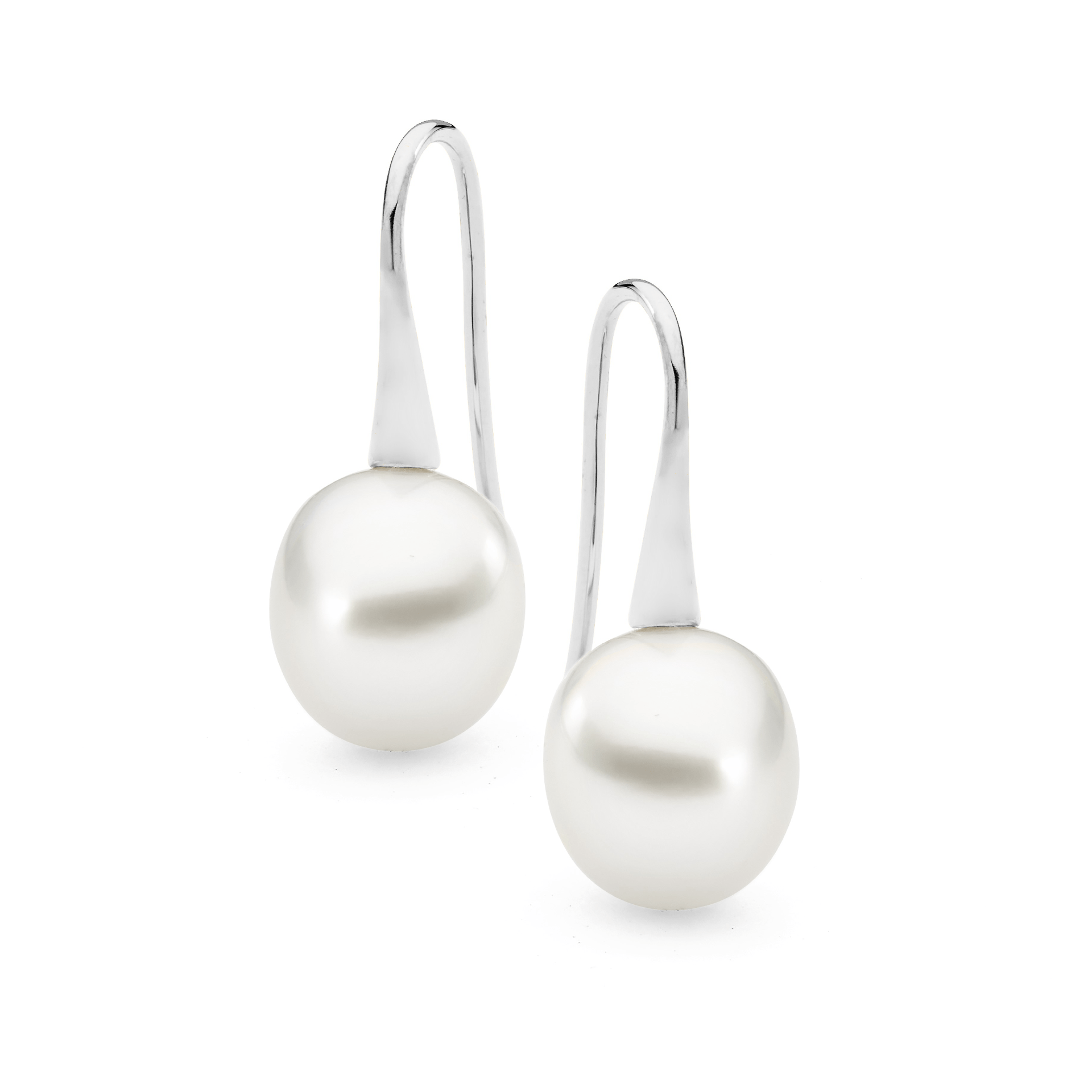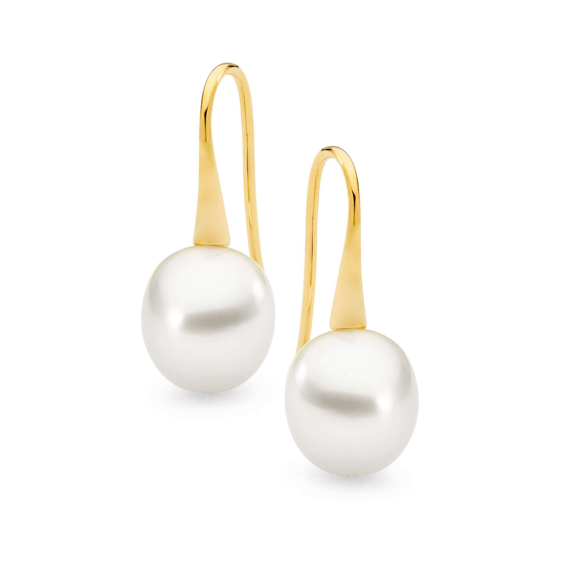 These trumpet style pearl earrings are set in 18ct yellow or white gold and feature a lustrous pair of 9-10mm oval/drop South Sea pearls.