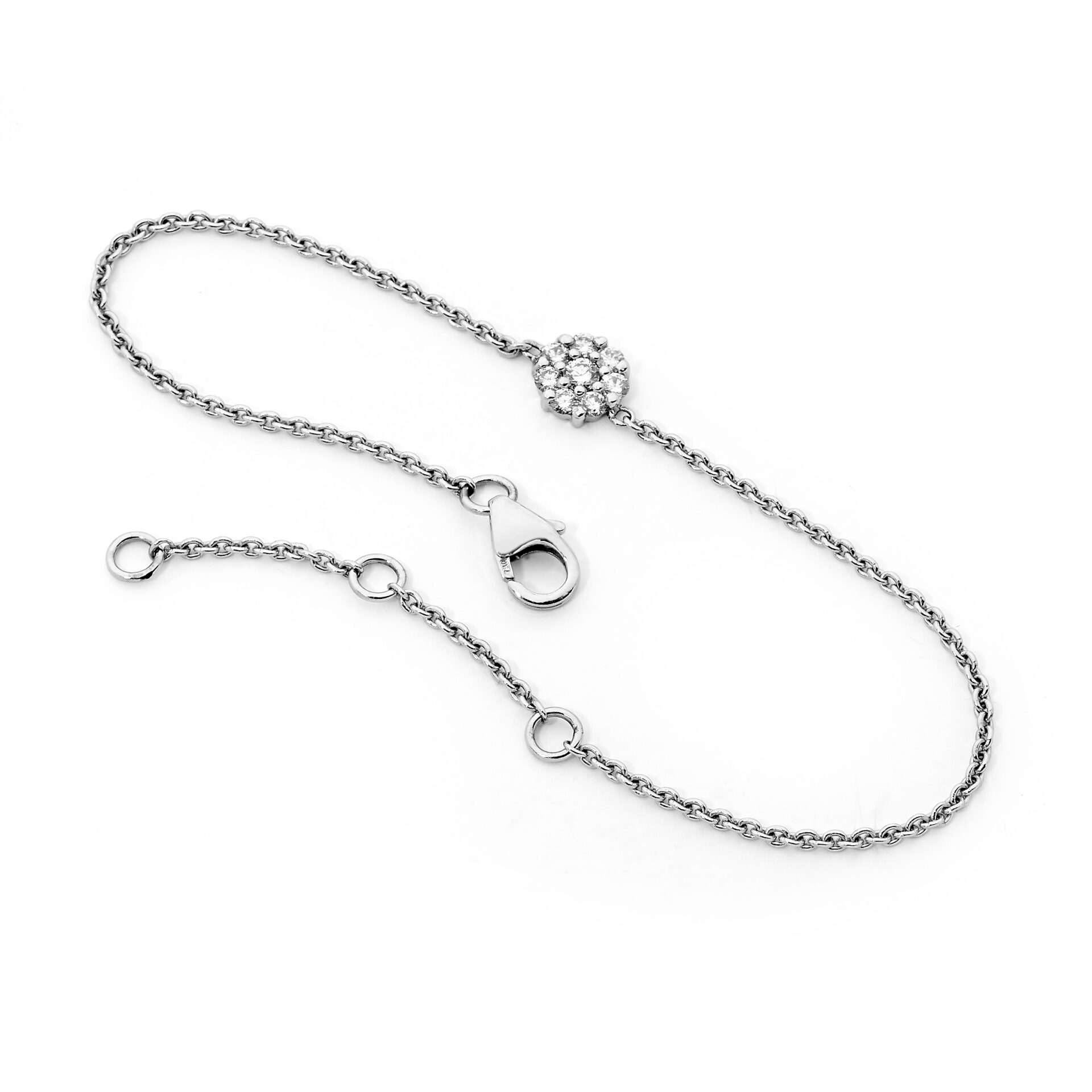 18ct white gold diamond cluster bracelet, featuring 8=0.23ct white diamonds (H/SI) on a 1mm 18ct white gold trace chain.