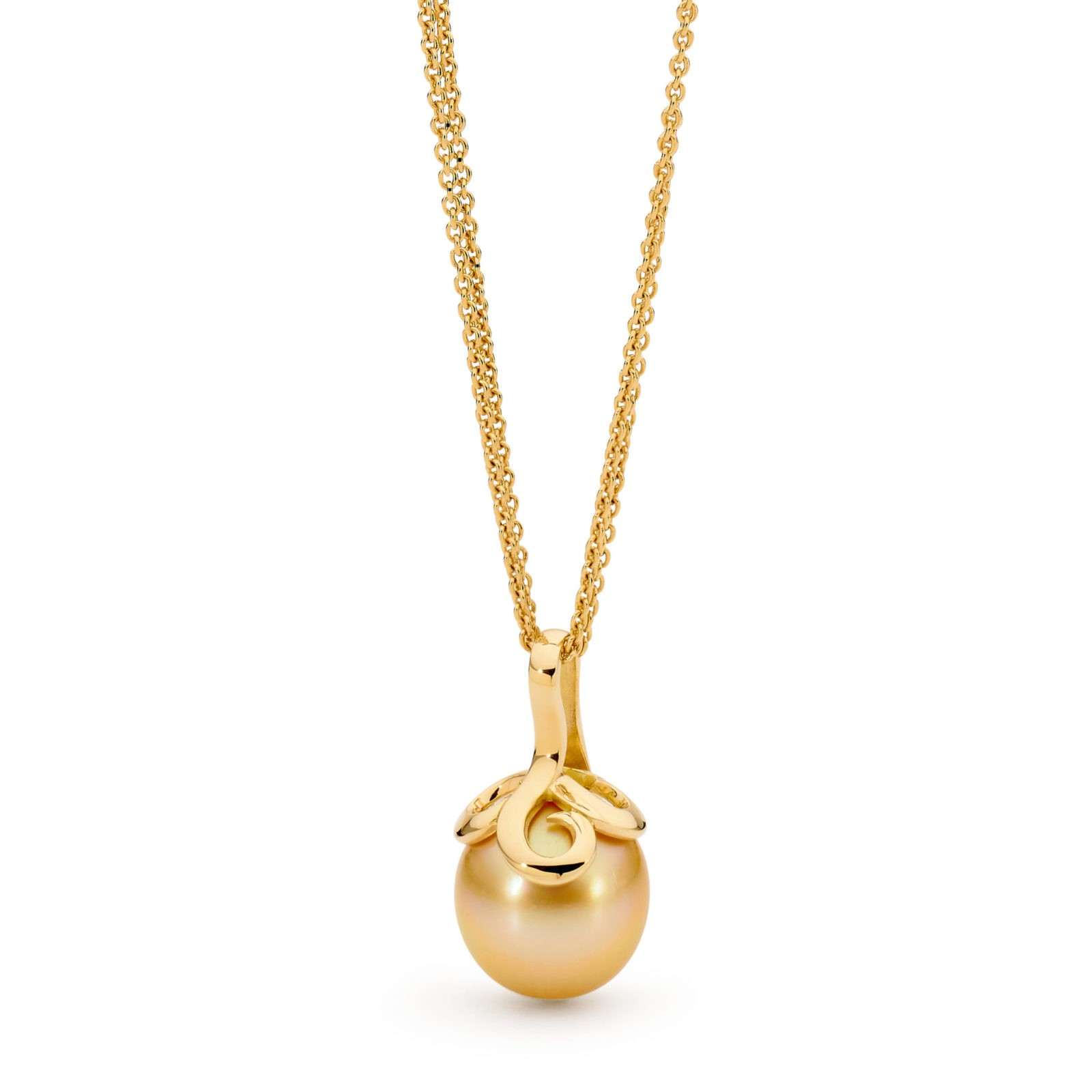 An exclusive Fleur de Lis design set in 18ct yellow gold and featuring an incredible intense gold 14-15mm oval/drop South Sea pearl.