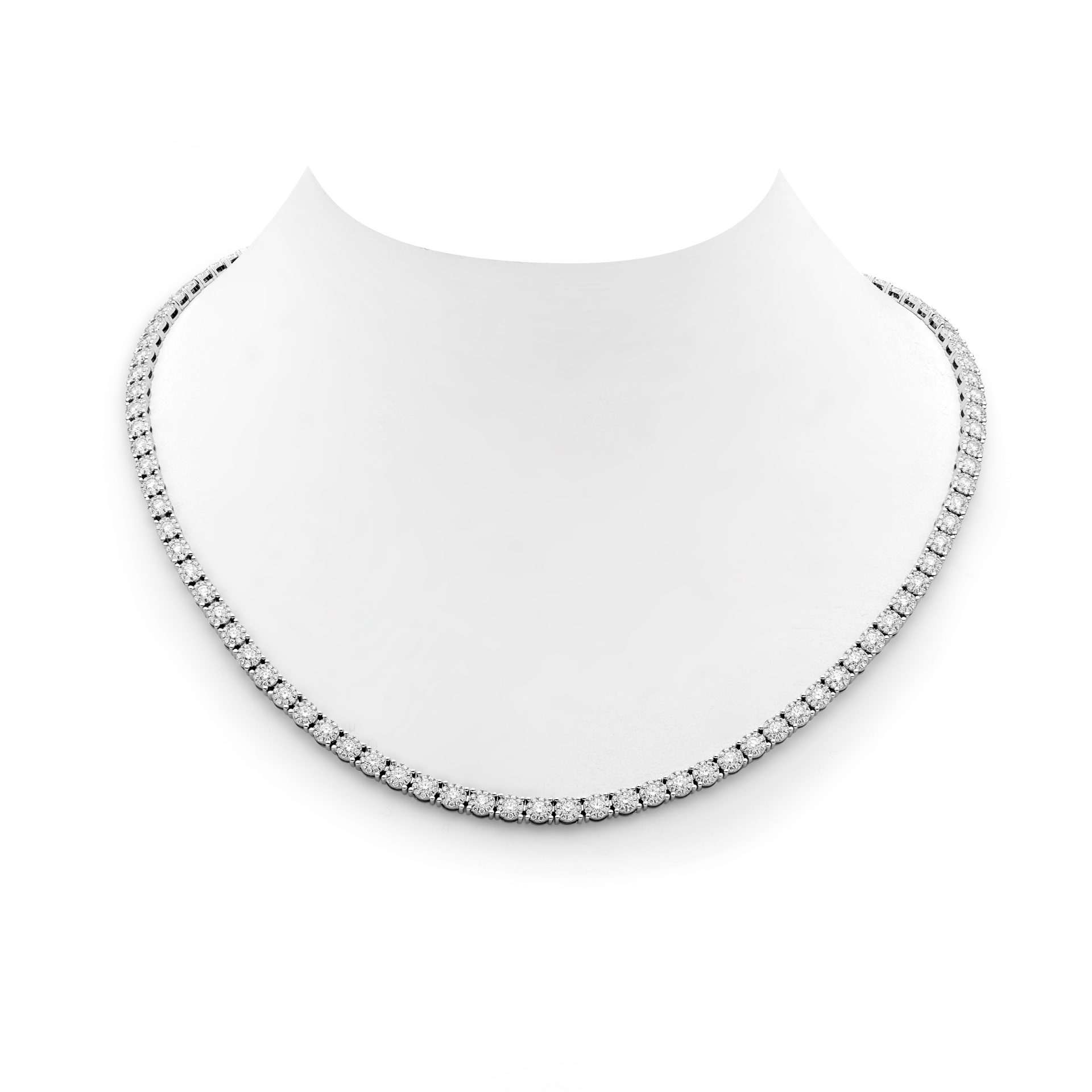 Set in 18ct white gold, this elegant diamond tennis necklace features an illusion style setting (TCW=7.78 G/SI).