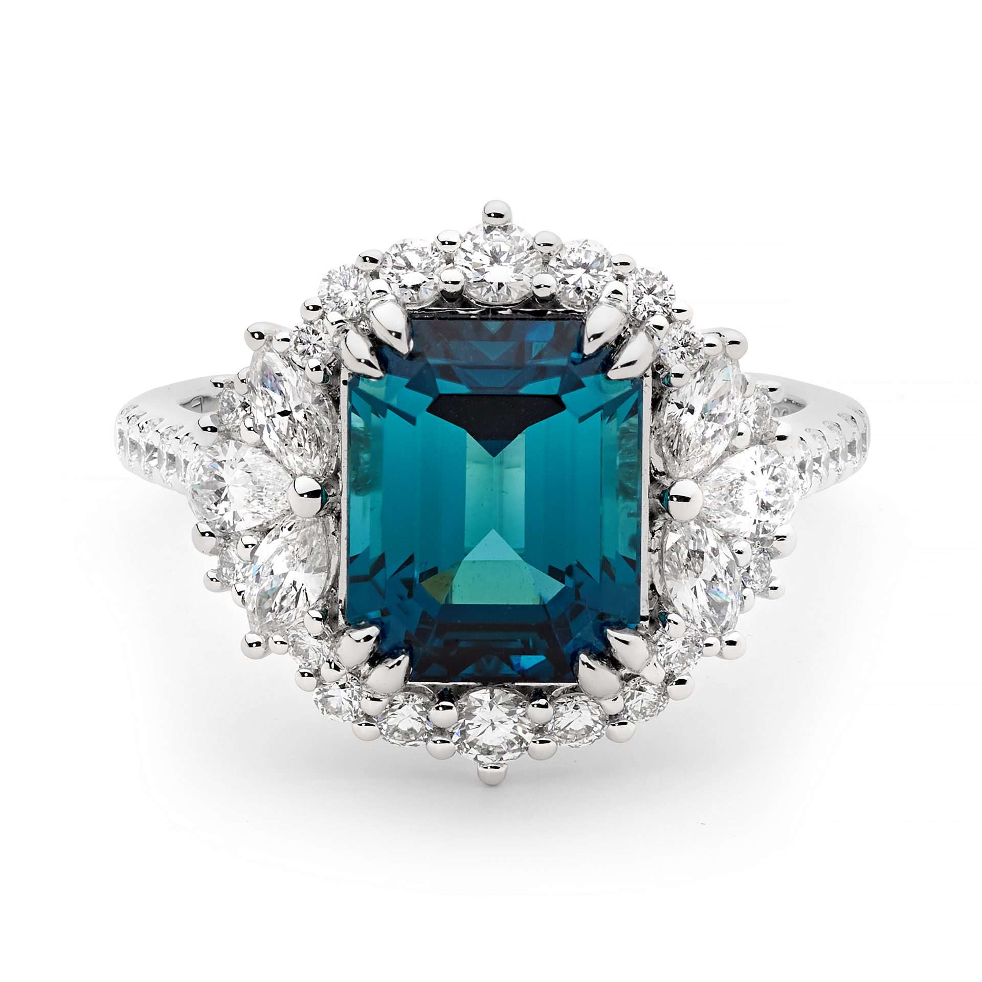 This breath-taking 18ct white gold ring features a dazzling 3.84ct emerald cut Indicolite (Tourmaline) and is surrounded by a selection of G colour, SI clarity diamonds in the following shapes and sizes – 30x round
