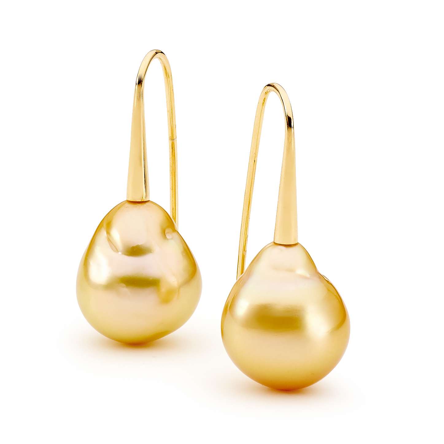 Elegant and unique, these 18ct yellow gold French hook earrings feature two drop baroque (13.6 x 16.1mm) intense gold pearls with excellent lustre, showcasing the beautiful deep hues golden pearls can offer.