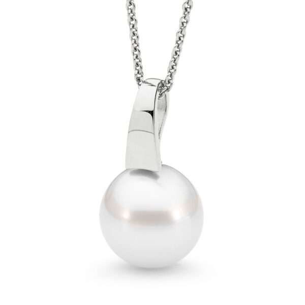 This stunning pearl pendant has been handcrafted in 18ct yellow gold and features a lustrous 13-14mm Australian South Sea oval/drop cultured pearl and includes 3=0.045ct G/SI round brilliant cut diamonds.
