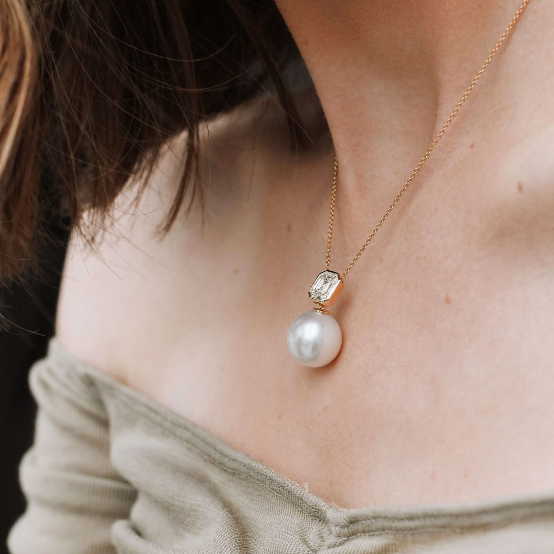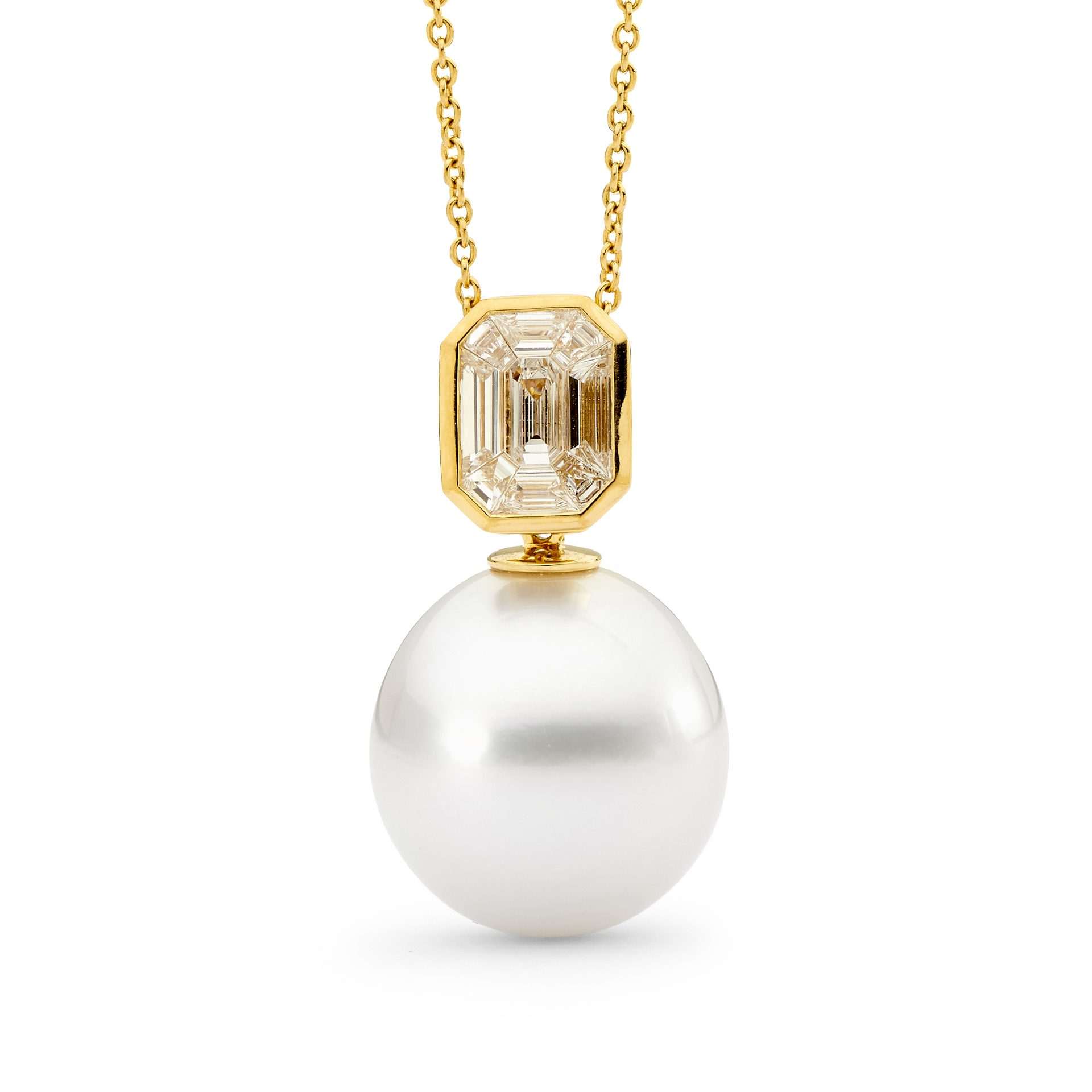This elegant 18ct yellow gold emerald cut diamond pendant (9=0.70ct G+/VS-SI) features a detachable 15.2mm pink/white short oval Australian South Sea pearl on an adjustable 18ct yellow gold fine trace chain (45cm).